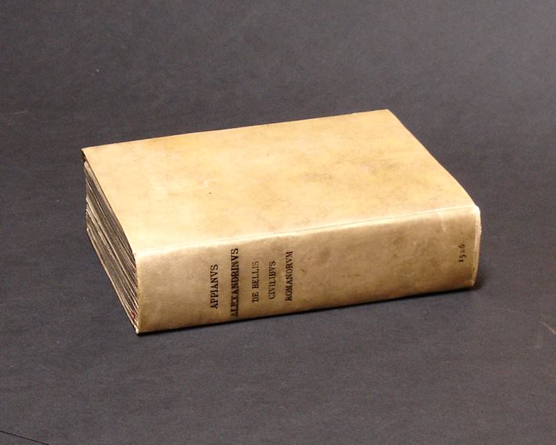 8vo. 372 unnumbered leaves. Modern overlapping vellum 14.5 cm (Ref: Hoffmann I,216; EDIT16: CNCE 2197; Graesse 1,169; cf. Ebert 849) (Details: Title within woodcut floral borders; short title on the back; good white paper. Latin translation only) (Condition: Good condition; old and small ownership entry on the title) (Note: Appianus, 2nd century AD, originating from Alexandria, gained Roman citizenship, and went to Rome. There he was a lawyer, and wrote his ‘Roman History’ in Greek (Rhômaïka). It treated the Roman conquests arranged ethnographically in 24 books. ‘Loyal and honest, an admirer of Roman imperialism, he wrote in the plain koinê, and though interested mainly in wars and unreliable about Republican institutions and conditions, preserves much valuable material’. (OCD 2nd ed. p. 87) The Greek text was first published in 1551 in Paris, by Carolus Stephanus. The first publication of any of the works of Appian however was the Latin translation by Pier Candido Decembrio, (in latin Petrus Candidus) dating from 1472. It was apparantly a success, because it was repeated in 1477, 1492, 1494, 1495. 1499. 1500 and 1526. The Latin translation deals with the part on the Civil Wars (5 books), and offers also a ‘liber illyricus’, ‘liber celticus’, ‘liber lybicus’, ‘liber syrius’, ‘liber parthicus’, & ‘liber mithridaticus’. This translation of 1526 is a reissue of the edition of 1500, also published in Venice. The translation of Candidus is not without value. Graesse 1,169: ‘Cette version (Candidus’ translation of 1472) est très importante pour la critique du texte, le traducteur s’étant servi d’un manuscrit assez correct et l’ayant traduit presque littéralement’. Ebert criticizes its style, he calls the translation obscure and bombastic, but he also underlines its critical value. (Ebert 849) Pier Candido Decembrio, born in 1399 in Pavia, was a well-known Italian Renaissance humanist, prolific author, and classical scholar. He was secretary to Filippo Maria Visconti, Duke of Milan for thirty years, from 1450 ‘magister brevium’ to Pope Nicholas V, and later to Pius II. The translation of Appianus was commissioned by Pope Nicholas V, after Candido’s arrival in 1450 in Rome. Candidus, who had been a pupil of the Greek refugee Manuel Chrysoloars, is best known for his translation of the Republic of Plato, which he completed in 1440. He died in Milan in 1477) (Dizionario Biografico degli Italiani – Volume 33 (1987)) (Provenance: In ink on the title ‘Da commudidade de Bellem’, an ownership entry of the Jerónimos Monastery, or Royal Monastery of Santa Maria de Belém in Lisbon, founded in 1501. The monastery has been dissolved in 1833. Its building is now an important architectural monument. On the internet we found only 2 books with this entry/provenance, in Portuguese libraries) (Collation: a-z8, &8, ?8, R8, A-C8, aa-rr8, 2s4) (Photographs on request)