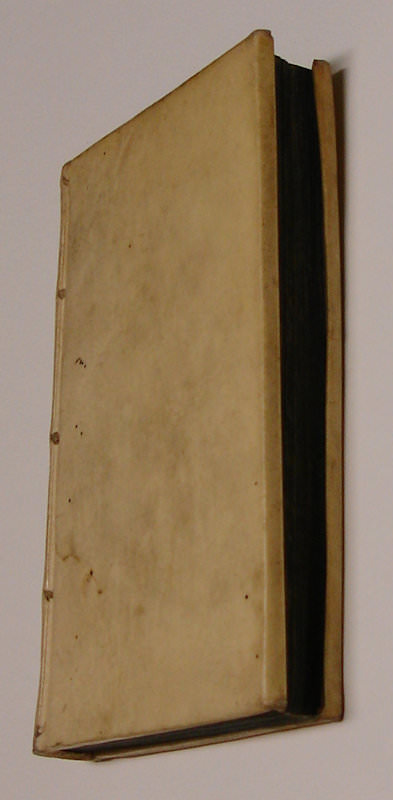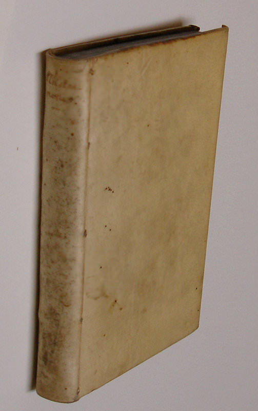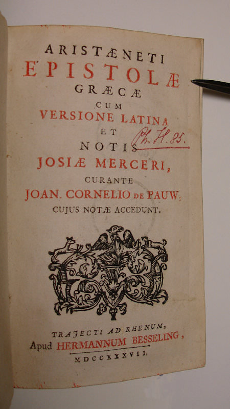 4to. (XXIV),287,(1 colophon) p. Overlapping vellum 15.5 cm (Ref: Hoffmann 1,240; Schweiger 1,44; Dibdin 1,292; Fabricius, Bibliotheca Graeca, ed. 4a, Hamburg 1780, p. 696; Brunet 1,448; Ebert 1066; Graesse 1,204) (Details: 5 thongs laced through the joints. Title printed in red and black. Woodcut ornament on the title. Greek text with facing Latin translation, commentary on the lower half of the page. Edges dyed blue) (Condition: Vellum slightly soiled. Stamp and name on the front flyleaf. Small part of the right lower corner of the front flyleaf cut off, and renewed. Small shelf number in red ink on the title. Two stamps on the verso of the title) (Note: A survey of erotic motives in the literature of Greece and Rome. Aristaenetus is the established name of the author of a collection of love letters in two books, probably from the beginning of the 6th century AD. It survives only in one Codex, of which the first folio with the name of the real author is lacking. Aristaenetus (Bestpraiseworthy) is only applied to the sender of the first letter. This is clearly a case of an imaginary letter-writer. The sources used are Plato, Menander, Lucianus, Alciphron, Philostratus , the ancient novels, and love elegies of Callimachus. Aristaenetus draws however in a conventional way a veil over too explicit love-making. The collection is a kind of survey of erotic motives in the literature of Greece and Rome. Everyting erotic however is covered with a veil of prudery. Aristaenetus ends after some cuddling before the bedroom is entered. (Neue Pauly, 1,1087) The collection was allready attributed to Aristaenetus in the ‘editio princeps’ of Antwerp 1566, edited by J. Sambucus. An edition with a Latin translation was published in 1595 in Paris by Iosias Mercier, the 4th edition of which dates from 1639. Mercier was the first to observe that the first letter of the collection was imagined to have been written by one Aristaenetus, and that the collection belonged to the genre of imaginative epistolography. Aristaenetus had to wait almost a century for the next edition, which appeared in 1736 in Utrecht, produced by Jacobus van Lanckom. Exactly the same edition was brought on the market by the Utrecht publisher Hermannus Besseling, only the impressum on the title differs, the rest is exactly the same. It was said that Aristaenetus was put to sleep in the commentary of Pauw. A revised edition was published in Zwolle in 1749. Cornelis de Pauw, born ca. 1680 in Utrecht, was canon of the ‘Sint Jan’. He was a classical scholar of some repute, and published several editions of Greek and Roman authors, Hephaestion, Horapollo, Anacreon, Quintus Smyrnaeus, Theophrastus’s Characters, Phrynichus, Aeschylus. By some detractors he was considered to be an ‘homme médiocrement savant’, whose ignorance was only exceeded by his impudence. He died in 1749) (Provenance: On the front flyleaf a stamp: ‘Prof.Dr. Joh. Irmscher, Berlin NO 55, Erich-Weinert-Strasse 126’. Johannes Irmscher, born in Dresden 1920, was a classical philologist and byzantine scholar, who made his carreer in the DDR. He died in 2000. On the same flyleaf also in ink: ‘C. Schoenemannus, Isleb. 1782’. This book once belonged to the German classical scholar and geographer Karl Traugott Gottlob Schoenemann, born in Eisleben in 1765. He studied classical philology and ancient geography in Göttingen. In 1787 and 1788 he published the treatises ‘De geographia Homeri’ and ‘De geographia Argonautarum’ . He died prematurely in 1802. Posterity is still thankful for his ‘Bibliotheca historico-litteraria patrum latinorum a Tertulliano usque ad Gregorium M. et Isidorum Hispalensem’ (1792/94), a still indespensable work of reference for early Christian Latin literature, from Tertullian to Isidor of Sevilla. On the title in red ink: ‘Ph.H. 85’. On the verso of the title a round stamp of: ‘Biblioth. Gymn. Ill. Gothana’. This stamps dates from before 1859. In that year the local ‘Gymnasium Illustre’ and the ‘Herzogliches Realgymnasium’ were transformed into the ‘Gymnasium Ernestinum Gotha’. (See Wikipedia ‘Ernestinum Gotha’) (Collation: *8, 2*4, A-S4) (Photographs on request)