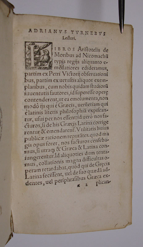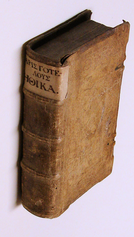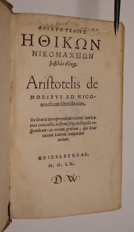 8vo. (VIII),567(recte 571),(1 colophon),(4 blank) p. Contemporary blind-tooled pigskin over wooden boards. 17.5 cm (Ref: VD16 A 3403; Hoffmann 1,291; Schweiger 1,52; cf. Dibdin 1,326 & Moss 1,126 for the edition of 1555; cf. Graesse 1,212; Cranz, A bibliography of Aristotle editions, 1501-1600, no. 108.398; J. Lewis, ‘Adrien Turnèbe (1512-1565), a humanist observed’, Genève, 1998, p. 127/28) (Details: Nice contemporary pigskin over wooden boards. Back with 3 raised bands. Boards decorated with a row of blind-tooled rolls, comprising floral motives and heads in medallions. The central panel is adorned with floral motives and palmets. The blind-stamped year 1565 or 1563 is vaguely visible at the bottom of the central panel on the upper board. Greek text with facing Latin translation, printed in 2 columns) (Condition: Pigskin age-tanned, worn and scuffed. Paper label at the head of the spine with a short title on it. Small damages to the pigskin. The clasps and catches are gone. Three small ownership inscriptions on the front endpapers. Two old initials in the lower margin of the title page. Small stamp on the verso of the title. A strip of the blank uppermargin of the title torn off, without affecting the text. Some contemporary ink marginalia) (Note: The Greek scholar Aristotle, 384-322 B.C., is one of the foremost names in the history of thought, and perhaps the most influential of all who have ever written. His influence on Western science and culture is immense. Aristotle’s treatise ‘Nicomachean Ethics’ is perhaps ’the greatest and most famous of all works on morals, certainly the most notable exposition of Greek ethics. The title is derived from the name on Aristotle’s son Nikomachos (…). It falls into ten books, and its fundamental principle is the doctrine of the Mean, according to which every virtue is a proper blend of two opposed and non-moral tendencies (as courage, of fear and daring), and lies between two vices, resulting from the exaggeration of one tendency or the other’. (H.J. Rose, ‘A history of Greek literature’, London, 1965, p. 275/76) § This Heidelberg edition of 1560 is a reissue of an edition with the same title, which was published in Paris in 1555 and edited by the French scholar Adrianus Turnebus (Adrien Tournèbe), 1512-1565, professor of Greek in that city, and a specialist in Greek textual criticism. In the preface (Adrianus Turnebus lectori) to the 1555 edition, repeated in this 1560 edition, Turnebus declares that he edited the Nicomachean Ethics with the help of Pier Vettori’s observations (ex Petri Victorii observationibus) and some very old manuscripts (ex vetustis aliquot exemplaribus). He also realized that this Greek text should also be accessible to students of philosophy who knew only Latin. It was necessary therefore to correct and emend the Latin text. Because translators from Greek into Latin added always something of their own ideas to a translation (de suo quaedam addentes), or made the Latin text much longer by explaning paraphrases (paraphrasibus Graeca explicantes), it is not possible to bring the Latin translation into line with the original Greek text (ut singula singulis responderent). To avoid an uneven division of the text and translation, he thought it necessary to make a translation that connected the Latin translation to the Greek text (Graeca & Latina coniungerentur). (Adrianus Turnebus lectori, page a2 recto & verso) The Greek text of the edition of 1555 of Turnebus was based on the edition of 1547, which was published by the Italian scholar Pier Vettori in Florence) (Provenance: On the front pastedown a small name: ‘Nagel’. § On the front flyleaf the ownership entry of: ‘Daniel Walasser, Giengensis’. Who this Daniel Walasser of Gien (a French city in the department of Loiret) was, we could not find out. § On the same leaf also: ‘Ex libris Jacobi Zenetti, 1821’. The German ‘Privatgelehrte und Schriftsteller’ Jakob Zenetti, 1801-1844, received his doctor’s degree in 1829 at the University Ingolstadt-Landshut-München. He lived in Augsburg, and seems to have been a philanthropist. The Zenettistreet in Augsburg is called after him. He wrote ‘Einfluss der Philosophie auf das Leben’, second edition, Augsburg 1842, and some poetry, e.g. ‘Der ägyptische Joseph: in vier Gesängen’, Augsburg, 1843. § On the title, below the imprint, the initials D.W. § On the verso of the title a small and round stamp: ‘Sammlung des Dr. Hans Hasso v. Veltheim’. In the centre of the stamp a coat of arms. Hans-Hasso Freiherr von Ludolf Martin Veltheim Ostrau, 1885-1956, was a German Indologist, anthroposophist, Far East traveler, occultist, and author. He was of old Saxon nobility. He published several books about his travels through East Asia. (See Wikipedia: ‘Hans Hasso von Veltheim’) Hasso was the owner of the barock castle ‘Schloss Ostrau’ in Ostrau near Halle (Saale), which he turned it into a meeting point of Anthroposophists from all over the world. After the Second World War he was expropriated. Part of his library and art collection was brought to the Martin-Luther-Universität Halle-Wittenberg, the remaining was confiscated by the occupying forces of the Russians. (See for this library Wikipedia: ‘Schloss Ostrau’) See for Hasso’s portrait and death mask ‘Google Images’) (Collation: *4, a-z8, A-M8, N4, O4 (last 2 leaves blank) (the leaves d1 & d2 the page numbering is double) (Photographs on request)