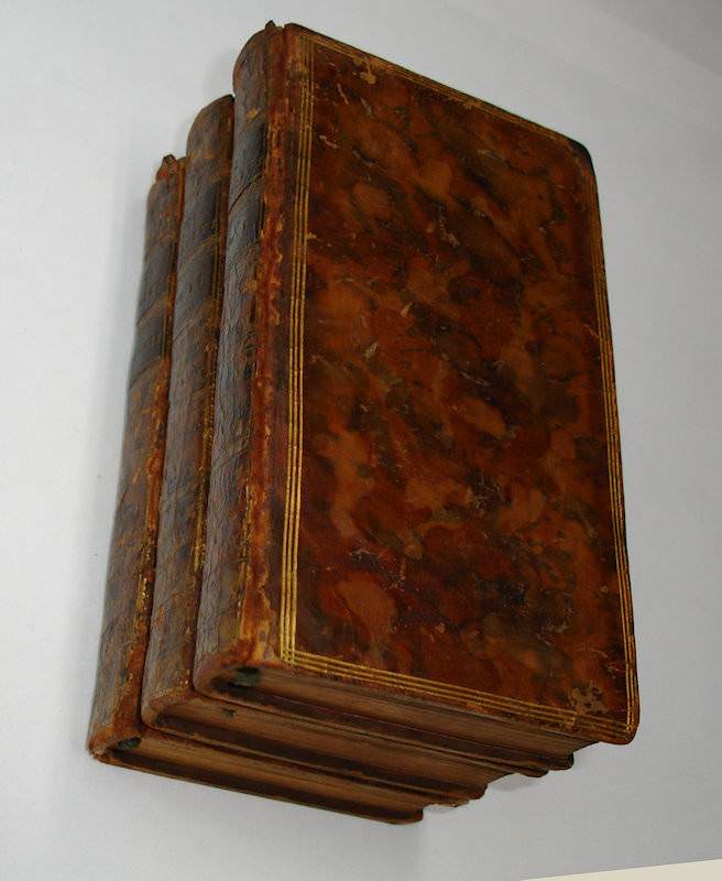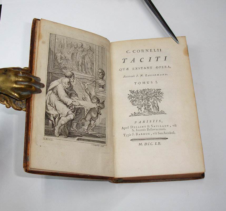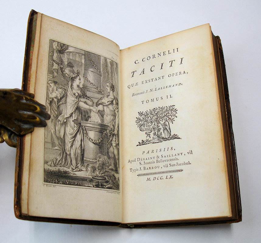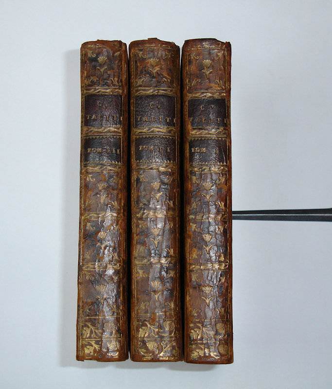 12mo. 3 volumes: XXIV,444; (VI),480; 456 p., 3 frontispieces. Mottled calf. 16 cm (Ref: Schweiger 2,1004: ‘L.’s Noten sind von Werth’; Dibdin 2,455: ‘one of the most beautiful and correct of all his classics’; Moss 2,645: ‘A pleasing and accurate little edition’; Graesse 6/2,10: ‘Jolie edition dans laquelle le texte d’Ernesti (of 1752) a ete corrigé à l’aide d’un manuscript de Paris’; Ebert 22175; Brunet 5,636: ‘Bon texte’) (Details: Backs with 2 shields, and gilt with fleurettes. Edges of the boards and the bookblocks also gilt. Boards with triple fillet gilt borders. Marbled endpapers. The frontispiece of the first volume, designed by Ch. Eisen and executed by L. Lempereur depicts Tacitus in his study; Tacitus looks at a bust of Agricola, his father in law. The second frontispiece depicts Messalina, the wife of the emperor Claudius; the third Galba. Barbou’s woodcut printer’s mark on the three titles, depicting an old man who stands in the shade of a vine-entwined elmtree, symbolising the symbiotic relationship between scholar and publisher. The motto is: ‘Non solus’. Three nice engravings in the text) (Condition: Bindings scuffed, especially at the extremities. Corners bumped. Two joints are splitting. Front joint of volume three is cracking. Old ink inscription on the front flyleaf of volume one) (Note: The Roman historian Publius Cornelius Tacitus offered ammunition for many intellectual and political battles in 16th and 17th century Europe. The turmoil caused by the emerging new monarchies in England, France en Spain, civil and religious wars in Italy and Germany, and the plague, made Tacitus’ account of the state of the early Roman Empire increasingly topical and relevant. The debate Tacitus provoked in intellectual circles was of course on Roman history, but also on literary style, in Latin and the vernacular, but more so on historical and political thought. Tacitus ideas were not original, but he brought them in a forceful lapidary way, oneliners ready for the use in debate. Tacitus became in a corrupted world ’the one true guide for those involved in the awful revolution of modern times: he “teaches well the mode of life under tyrants, just as he teaches tyrants how to establish tyranny” ‘. (The Classical Tradition, Cambr. Mass., 2010, p. 921) The French humanist scholar Muretus (Marc Antoine Muret, 1526-1585) declared that ‘Tacitus’ descriptions of lost liberty, failed revolutions, vicious civil wars, and mad emperors amounted to a theater of our time’. (Op. cit., ibid.) The French encyclopedists of the 18th century ’turned Tacitus into an enlightened enemy of obscurantist princes. This is the Tacitus, wise and mild, who prevailed in Europe immediately before the French revolution’. (R. Ash editor, ‘Tacitus’, Oxford, 2012, p. 429) In the preface to this Tacitus edition of 1760 the French scholar Nicolas Lallemand acknowledges that he used for his work the editions of Lipsius, Ryckius, Ernesti, and especially the edition of J. Gronovius that was published in Leiden in 1721; he was advised, he tells, by Claudius Capperonerius, or Claude Capperonnier, custos of the Royal Library, and ‘Regius linguae Graecae professor’. Lallemand’s text contains the readings of some manuscripts of the Royal Library, especially of those which coincide with the ‘editio princeps’. Worldcat records 20 reissues of Lallemand’s edition between 1760 and 1832) (Provenance: On the front pastedown of all three volumes the armorial bookplate of G.C.J. Vosmaer. Gualtherus Carel Jacob Vosmaer, 1854 – 1916, was a Dutch zoologist. He was the son of the Dutch author Carel Vosmaer, who produced a successful translation of Homer’s Ilias and Odyssea) (Collation: pi1, a12, A-S12, T6; pi2, A-T12, V-X6; pi2, A-S12, T-V6) (Photographs on request)