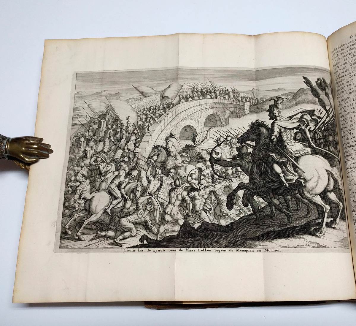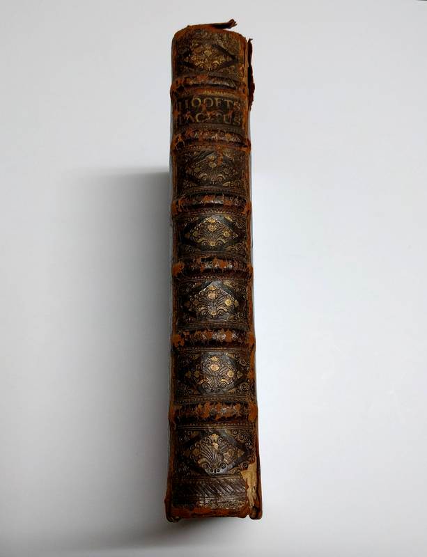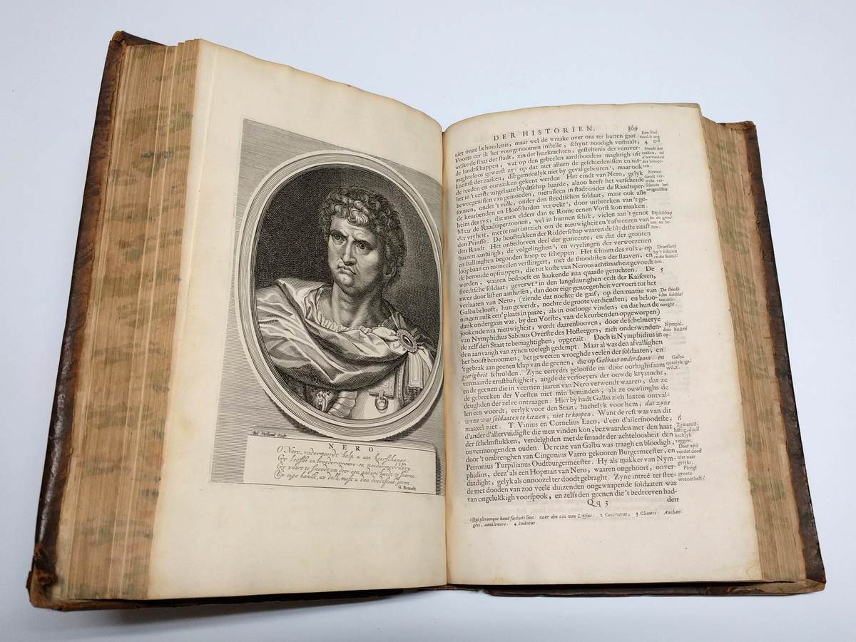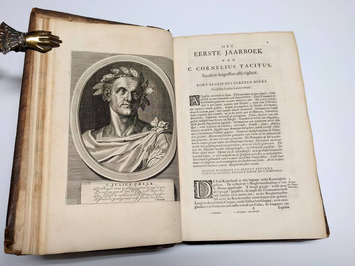 Folio. (XL),528,(4),11;(72) p., 14 engraved portraits & 8 folding historical plates. Calf 33 cm (Ref: STCN ppn 171376293; Geerebaert 137,5,II; OiN p. 359; Schweiger 2,1028) (Details: Back gilt and with 6 raised bands. Boards with double fillet gilt borders. Title in red & black. Woodcut printer’s mark on the title, depicting Ceres and Flora under a palmtree (Boom means tree); the banner at their feet reads: I.V.S. A.W. H.D.B., which means: ‘Johannes Van Someren, Abraham Wolfgangk, Hendrik en Dirk Boom’. Woodcut initials. 14 magnificent full-page portraits of Roman emperors engraved by A. Vaillandt, and 8 double-page battle and rural scenes engraved by I. Mulder) (Condition: Binding scuffed and scratched. Back rubbed and damaged at the head and tail. Corners bumped. Front pastedown stained, slightly damaged and with a bookplate. Faint name on the front flyleaf, small hole in somewhat soiled front flyleaf. Interior fine) (Note: The Dutch Renaissancist poet, playwright and historian Pieter Corneliszoon Hooft, 1581-1647, may be considered the founder of the literature of Holland’s Golden Age. His style is not easily accessible, and often shows a sentence structure derived from Latin. Around 1630 he started with his translation into Dutch of the works of the Roman historian Tacitus, 56-117 A.D. These translations of the ‘Annales’, ‘Historiae’, ‘Germania’ and the ‘Agricola’ were posthumely published in 1684 by his able biographer Geeraert Brandt, 1626-1685. Hooft, in who the genius of Tacitus had arisen, according to Brandt, was not satisfied with the previously published translations, and decided to make a translation of his own which suited the style of the Roman historian better. Hooft however never found time to publish his translation. In the preface Brandt tells that the manuscript with the translations came into his hands by chance, long after the death of Hooft. He then decided to rescue them from oblivion, and to publish them, more than 50 years after Hooft had begun to translate Tacitus. In the same year the firm of Boom brought also a cheaper and smaller quarto-edition on the market. According to Geerebaert, this folio-edition was printed first) (Provenance: On the front pastedown a woodcut bookplate of J.J.A. Poley and F. Poley-Scheele, made by the Dutch graphic artist Johan Melse (See: Johan Schwencke in ‘Den Gulden Winckel 31 (1932), p. 29-30) Johannes Adriaan Poleij, 1889-1951, married Francina Scheele, born 1891, in 1915 in the Dutch city of Goes) (Collation: (a)-(c)4, (d)-(g)2; A-3N-4, 3O-6, 3P-3S4, 3T6, 3V-3X4; A-S2 (leaf S2 verso blank)) (Photographs on request) (Heavy book, may require extra shipping costs)