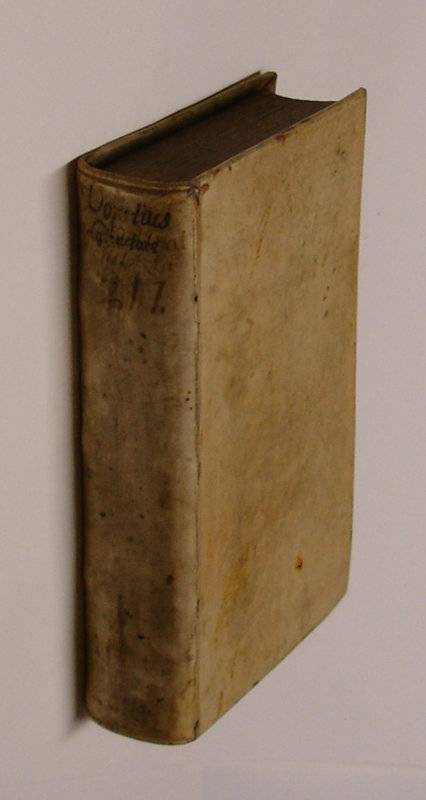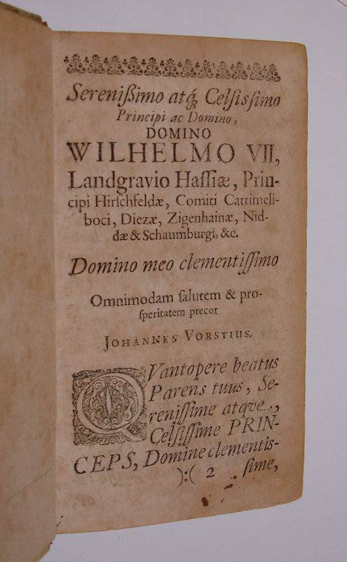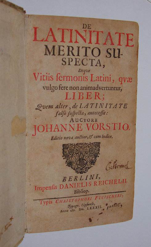 8vo. 2 volumes in 1: (VIII),282 (recte 272);(8 index); (XII);298;(26 index) p. Vellum 17 cm (Ref: Ad 1: VD17 12:130206A; Ad 2: VD17 3:314302R) (Details: 5 thongs laced through the joints. Manuscript title on the back. Title in red and black) (Condition: Vellum soiled and spotted. Front flyleaf removed. Small name on the first title. Blank lower corner of the first title cut off. Paper browning, as usual with German books of that period) (Note: The German philologist and theologian Johann Vorst, or Johannes Vorstius, 1623-1676, became after his studies master at several gymnasia (Flensburg, Berlin), meanwhile increasing his fame by producing learned books and editions of various Latin authors. The Philologia Sacra being the center of his work, he was also in his time one of the most distinguished experts on Hebrew. These works, his classical work, and his schoolbooks are now forgotten. He lives however on in the history of German linguistics, through a small booklet: ‘Observationum in linguam vernaculam specimen’ (Coloniae Brandenburg, 1669). Vorstius was inspired by the Roman linguist Varro, and as a sample of his intensive study of his mother tongue and its history, he offers in 19 chapters as many etymological monographies. Not one of his etymological studies is completely wrong, most of them actually are proofs of his admirable linguistic insight. Vorstius knew everything that was printed in Germany, the Netherlands, England and Scandinavia on the remains of older germanic languages. His arrangement of forms and meanings is chronologically generally correct, and he refrained from the irrelevant etymological riddles, that were so popular in his time. He didnot juggle with Hebrew, and showed his knowledge of Latin and Greek only in instructive parallels and analogies. (ADB 40,308/09) Traces of his linguistic and etymological interest can be found in the second part of De latinitate merito and falso suspecta, where Vorstius offers analogies between the Greek, Latin and German languages. De latinitate merito and falso suspecta is a study in Latin style, how to speak and write pure Latin. The correct use of Latin was in the 17th and 18th century still considered to be of importance. The use of exemplary Latin was for some scholars of that period the same as practising pure science. De latinitate merito and falso suspecta was first published in Berlin in 1669. Revised and augmented 2nd, 3rd and 4th editions appeared in 1674, 1669, 1682, 1698, 1703 and 1722) (Provenance: On the title in old ink ‘C. Stemel’) (Collation: Ad 1: ):(8, A-R8, S4. Ad 2: )(6, A-U8. X2) (Photographs on request)