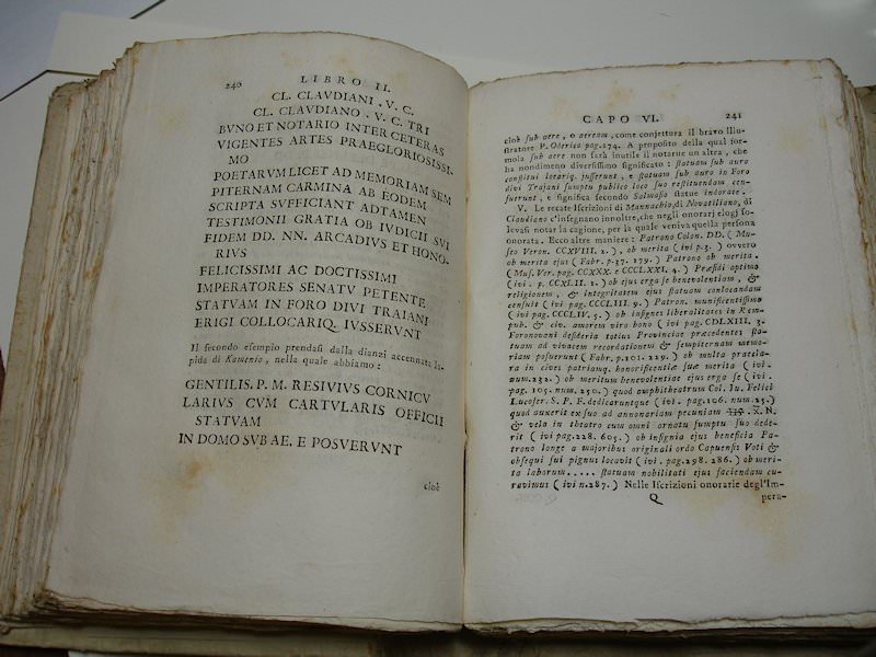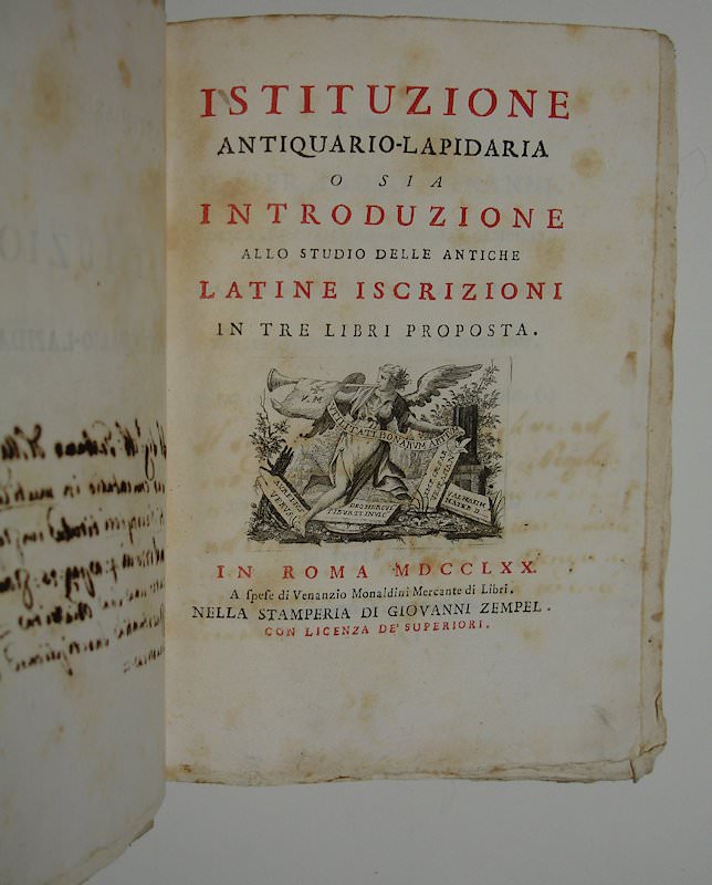 8vo. XL,532 (recte 536) p. Contemporary boards. 23 cm (Ref: Brunet 6,2 nr.29897; Graesse 6/2,502, where the second edition of Venice 1793 is mentioned; Ebert 24208, also mentioning 1793) (Details: A contemporary cardboard binding in good condition. Engraved printer’s device on the title, depicting a winged Fama who holds her trumpet; the motto reads: ‘Utilitate Bonarum Artium’; at her feet marble fragments of inscriptions; from the trumpet hangs a banner with the initials of the proud sponsor Venanzio Monaldini. Facsimile inscriptions throughout. Short title in ink on the back) (Condition: Some wear to the extremes. Some slight foxing. French title inscribed by a contemporary hand. Title slightly foxed) (Note: Sommervogel ascribes 161 works to the prolific Italian scholar and Jesuit Francesco Antonio Zaccaria, or Zacharias, 1714-1795. He published on church history, theology, canon law, but also on archaeology and Italian literature. He succeeded as librarian and archivist of the Ducal library of Modena the famous historian Muratori. Later he was appointed professor of church history at the Sapienza University of Rome. § The 18th century saw a deepening of the science of epigraphy; much emphasis was laid on the importance of historical sources, such as inscriptions and coins. There was a demand for well edited and trustworthy collections and manuals. With his ‘Istituzione’ Zaccaria published a manual devided into 3 books: 1: ‘Del pregio, e dell’eccellenza delle latine iscrizioni’, 2: ‘Della tessitura delle antiche iscrizioni’, 3: ‘Delle intelligenza delle iscrizioni’, and illuminated with numerous examples. The manual saw a second edition in 1793 and was also translated into Spanish; Zaccaria wrote also a manual on numismatics) (Collation: a8, b12, A-Q8, R10, S-2I8, 2K10. Pagination error in gathering R: 253/6 is repeated) (Photographs on request)
