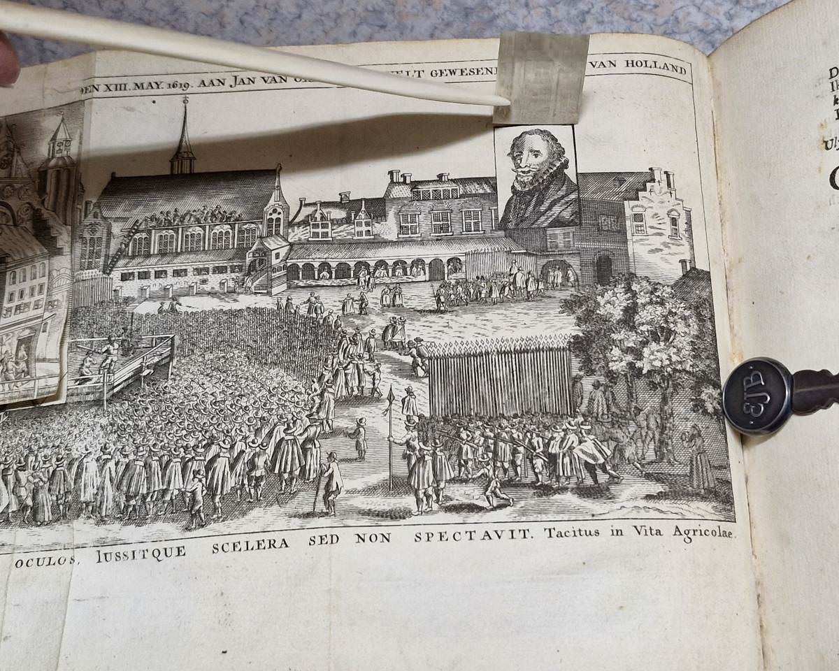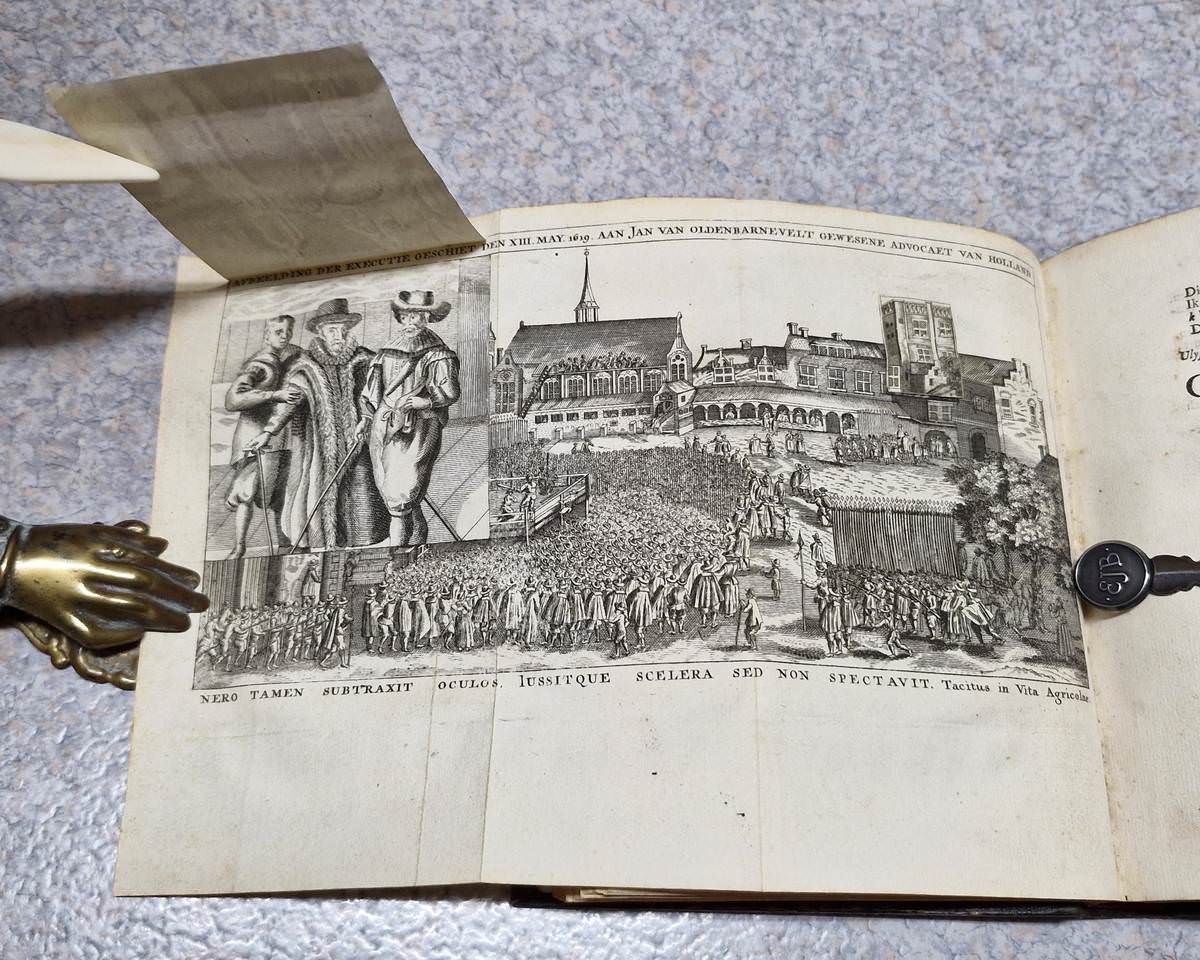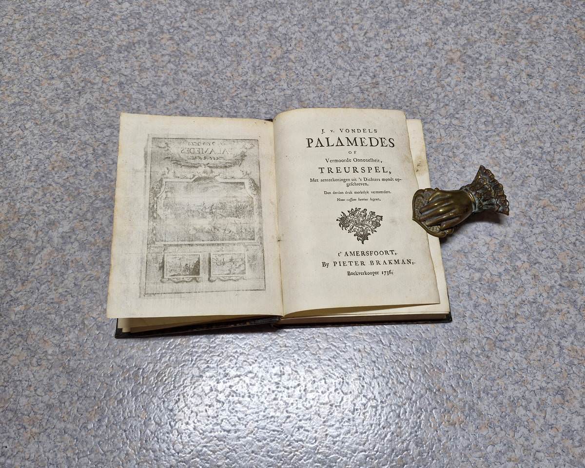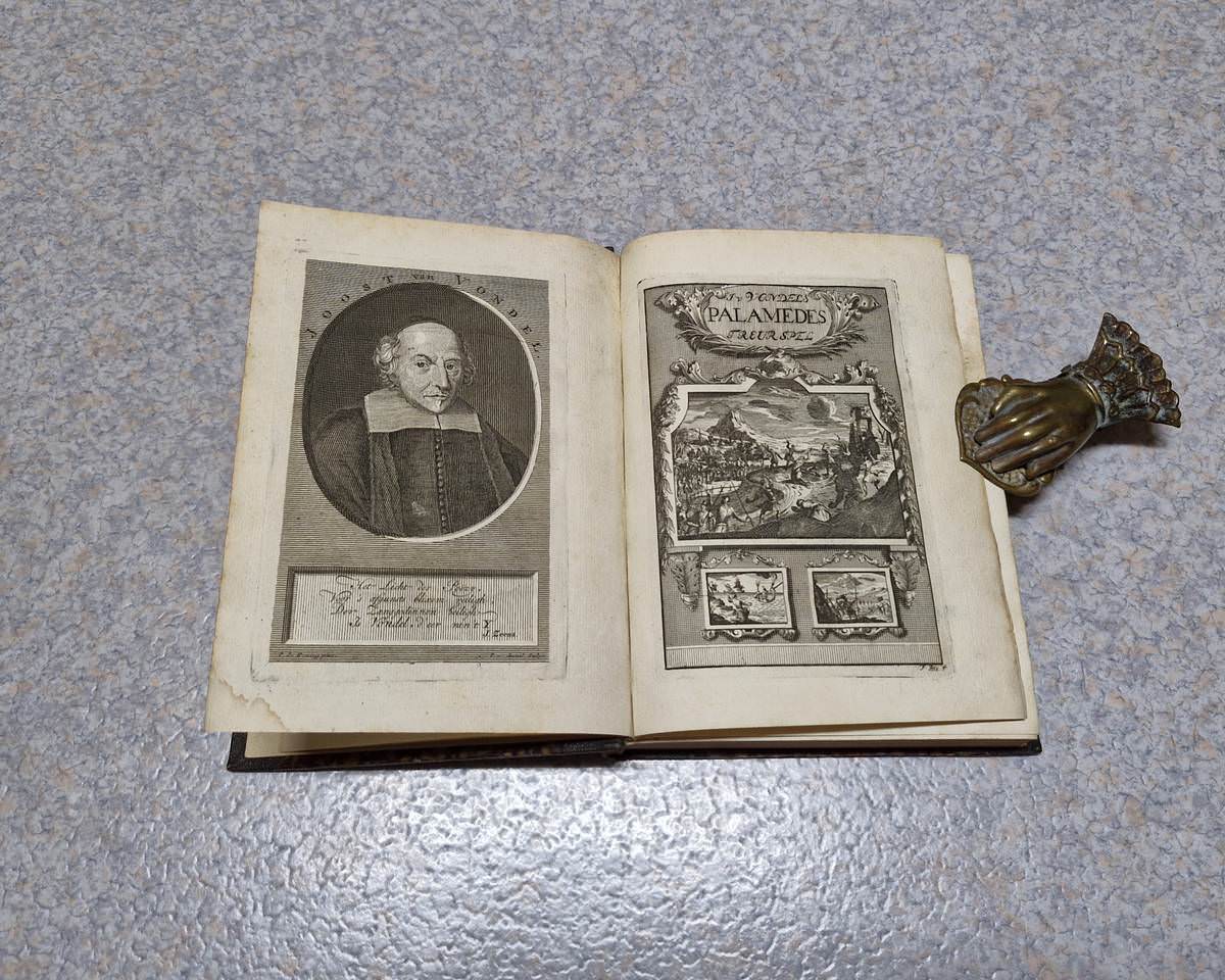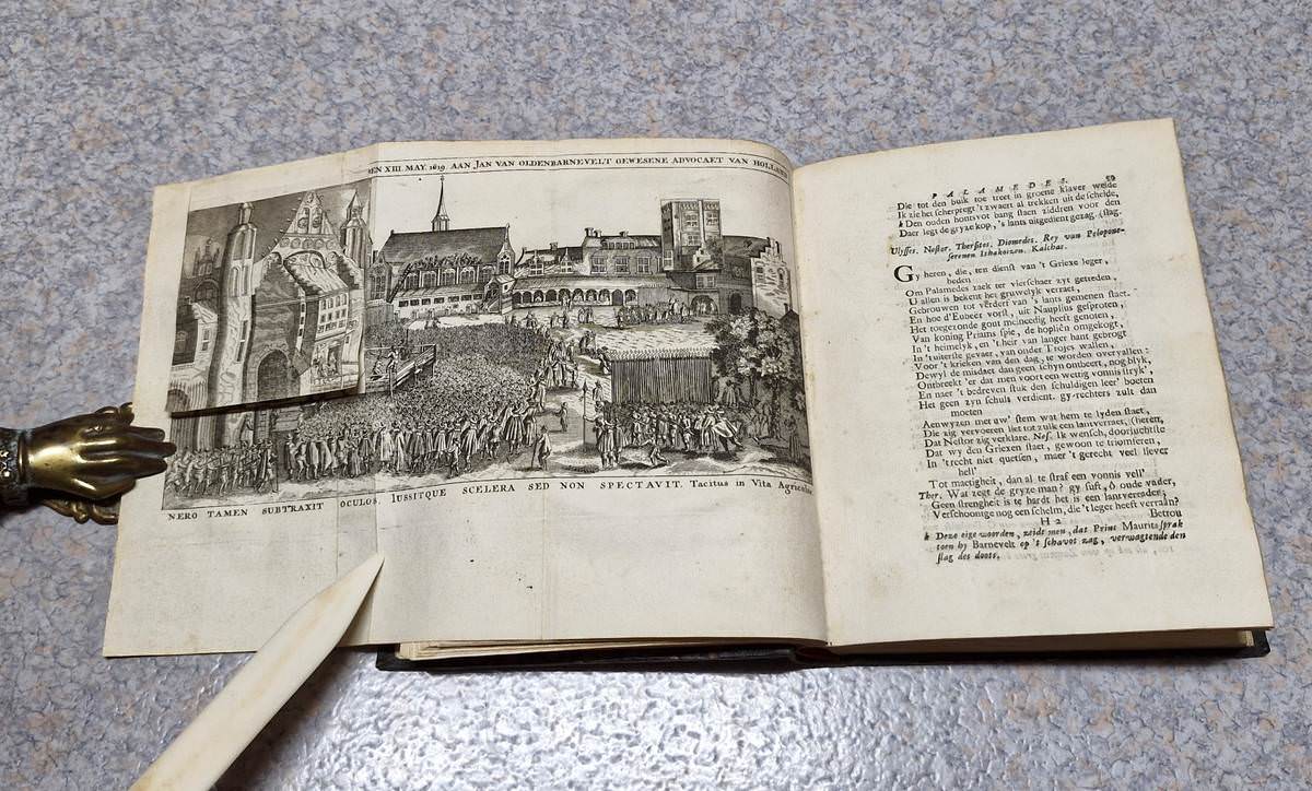 4to. 2 volumes in 1: (IV),(XVI),82;(2),179,(5) p. Frontispiece and plates (see description below). Early 20th century half cloth. 19 cm (Ref: STCN ppn 271408340; Schuytvlot 471; Unger 18,143) (Details: ‘Pieter Brakman’ was a pseudonym of the bookseller Pieter van der Veer in Rotterdam. (See: Ton Jongenelen. ‘De Keurdigten. Het levenswerk van Pieter van der Goes, boekverkooper.’ In: Mededelingen van de Stichting Jacob Campo Weyerman. 27 (2004), p. 57-67. Online at the site of DBNL). § Volume 1 opens with a portrait of the author, engraved by P. van Gunst; immediately followed by a frontispiece, signed ‘F Ble’ (possibly Frans van Bleyswyck), it depicts the stoning of Palamedes by the Greeks before the walls of Troy, as told by the Greek poet Apollodorus. Bound before the first page of the play we find an engraving of a proud poet laureate (Vondel) in the role of Wibberley’s ‘Mouse That Roared’, standing amids ferocious animals that want to devour him. In this volume at page 58 also a folding plate, depicting the beheading of J. van Oldenbarnevelt (Palamedes) on the 13th of May 1619 on the ‘Binnenhof’ in The Hague. This folding plate has 2 small moveable overlays, i.e. a small slip of paper, both depicting parts of a building; the first overlay hides a small portrait of Oldenbarnevelt, the other overlay depicts the ‘ridderzaal’ and covers the scene with the arrest of Van Oldenbarnevelt. § Volume two has 8 plus 1 plates, of which 1 is folding. Plate 1, an engraving of the famous ‘scale scene’, where Prince Maurits puts his sword on the scale in favour of strict Calvinist Gomarus (p. 4); plate 2, portrait of J. van Oldenbarnevelt, engraved by P. van Gunst (p. 40); plate 3, the famous Rotterdam statue of Erasmus (p. 114); plate 4, a portrait of Hugo de Groot engraved by P. van Gunst (p. 124); plate 5, a folding plate showing the burial of the dog of Schout (bayliff) Bond, made after a painting of Jan Miense Molenaer (p. 130); plate 6, portrait of prince William II, who Vondel attacked for his infamous assault on Amsterdam in 1650 (p. 156); plate 7, portrait of Cornelis de Wit, engraved by P. van Gunst (p. 164); plate 8, portrait of his brother Johan de Wit, also engraved by P. van Gunst (P. 164); between plate 2 and 3 has been added an engraving of an allegoric triumph held by Prince Frederik Hendrik of Orange, protector of the Dutch republic and its freedom (p. 65). This plate is not mentioned in the list of plates on the last but one page) (Condition: Gilt short title on the back) (Note: The playwright and poet Joost van den Vondel,1587-1679, who is considered the most prominent author of the Golden Age of the Dutch Republic, published his tragedy ‘Palamedes, oft vermoorde onnooselheit’ in 1625. In 1652 he published a second edition with drastic alterations. This edition of 1736 is based on that revised edition. Vondel expressed in the Palamedes his political views, accusing under a thinly veiled disguise of an oscure Greek allegoric story the strict Calvinist Contra-Remonstrants and Prince Maurits of Orange of a political murder, the beheading in 1619 of the ‘Land’s Advocate of Holland for the States of Holland’ Jan van Oldenbarnvelt, who had been the virtual ‘Prime Minister’ of the Dutch republic for 32 years. The unlawful killing of Palamedes on the ground of false accusations by the Greeks, stood for the execution of this Dutch statesman. The harsh and tyrannical villain, Agememnon, was clearly intended to portray Maurits, stadtholder of the Dutch Republic. Vondel stood for civil liberty, especially in religious matters. Vondel opposed with this ‘J’accuse’-like play any form of tyranny, of the church and of the government. § The second title in this binding contains Vondel’s satires (Hekeldichten). He began to publish them shocked by the execution of Oldenbarnevelt in 1619. One of the first is ‘Geuzenvesper’ (Geuse Vesper), a satire against the strict Calvinists and the judges who had condemed Van Oldenbarnevelt. The most famous satire is his ‘Roskam’, in which he attacked corrupt regents, and ‘Harpoen’ against the view of the strict protestant Contra-Reformists, who found that their authority should also apply outside the church) (Provenance: On the front flyleaf in ink: ‘Mijn besten vriend J.D. Peesee (?) ter herinnering aan 1 Januari 1921’) (Collation: Volume 1: pi4 (including frontispiece and a portrait of Vondel), *-2*4, A-K4, L1 (Leaf L1 missigned F1). Volume 2: pi1, A4 (minus leaf A4), B-V4, W4, X-Y4, Z2. (This volume contains a rarity: after gathering ‘v’ it continues with a gathering signed ‘w’) (Photographs on request)