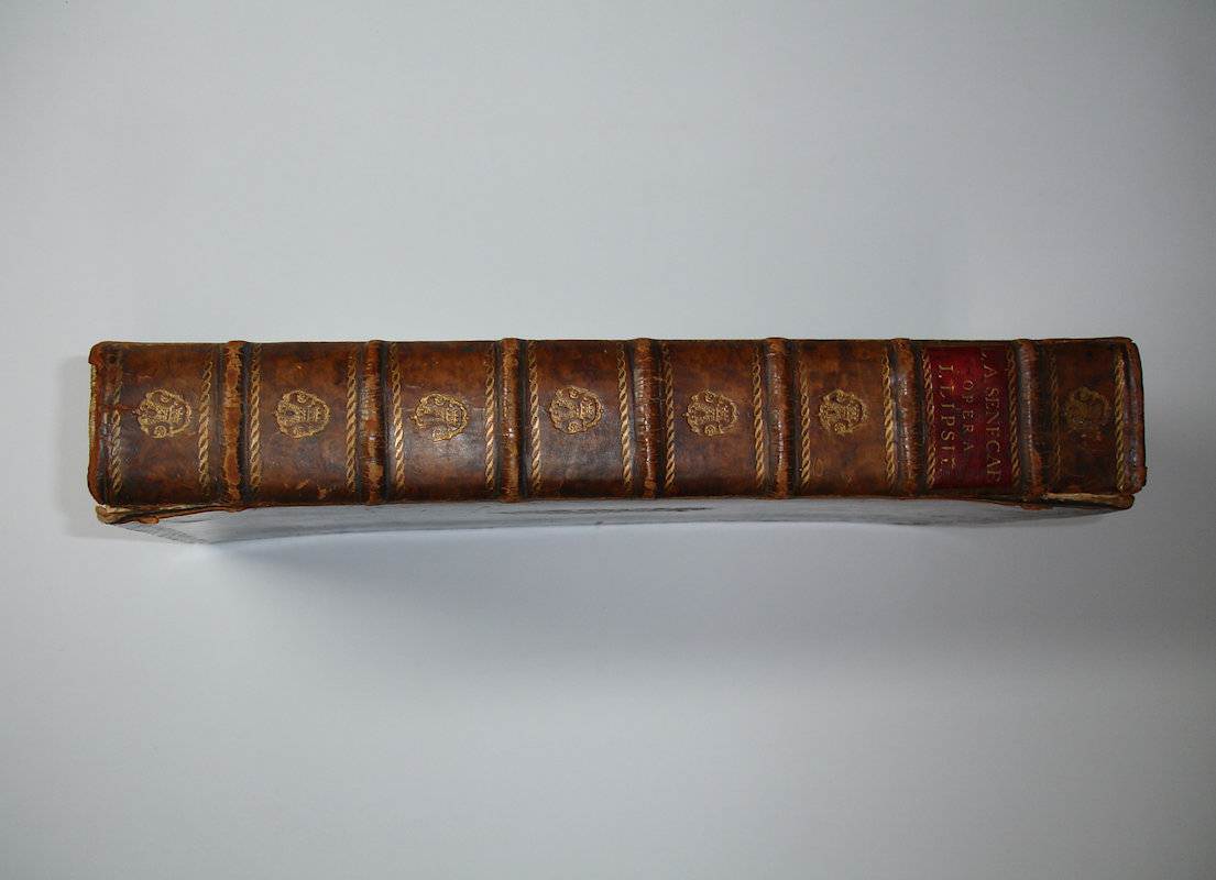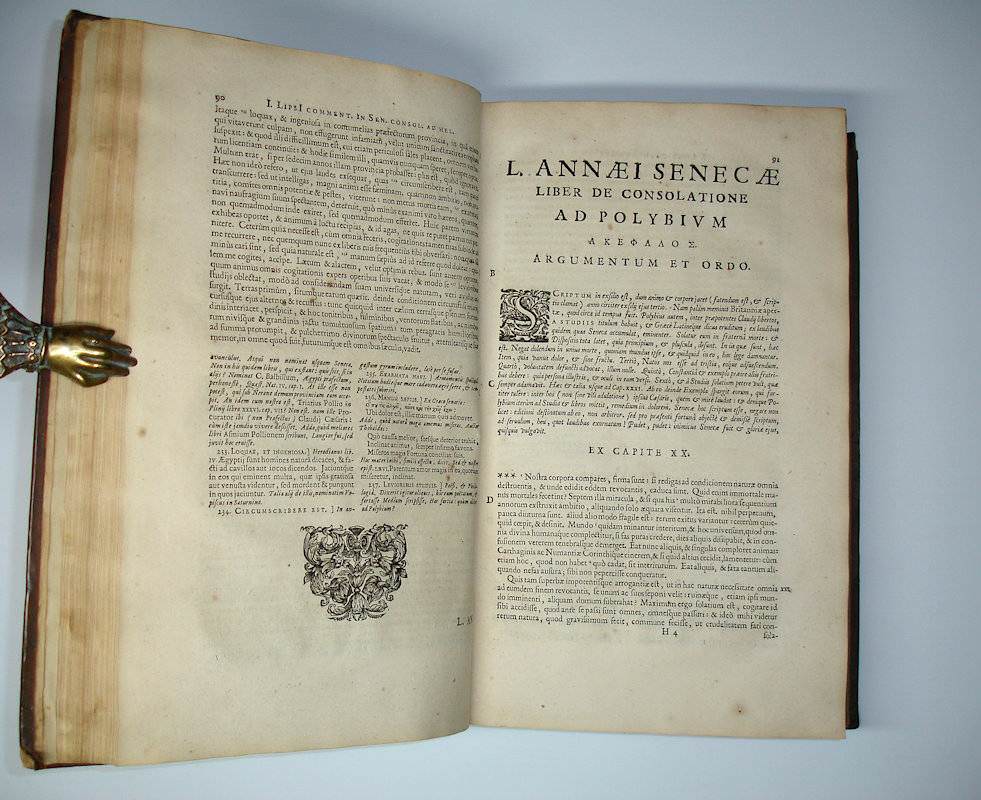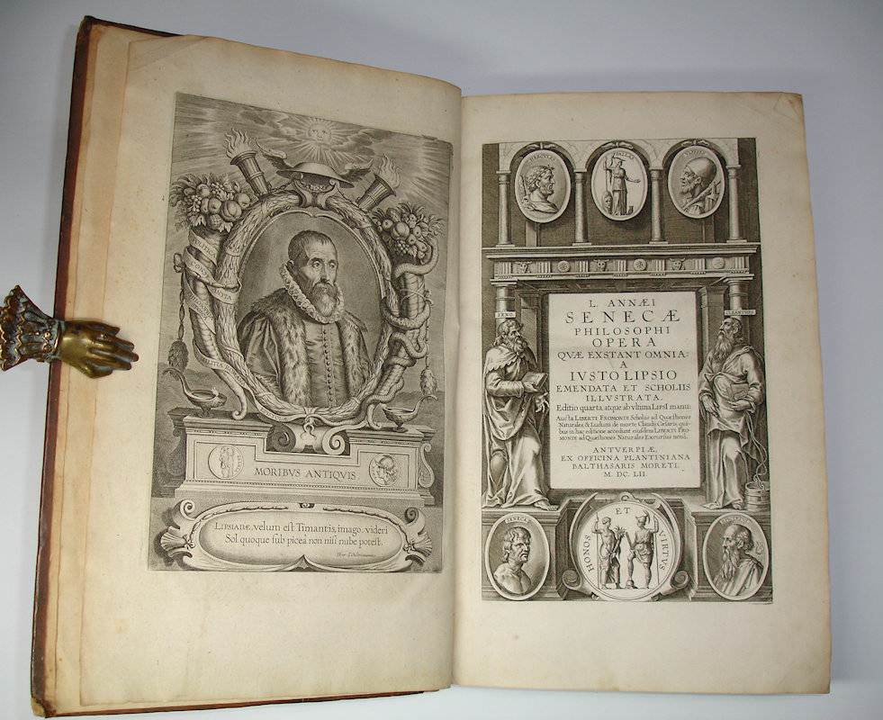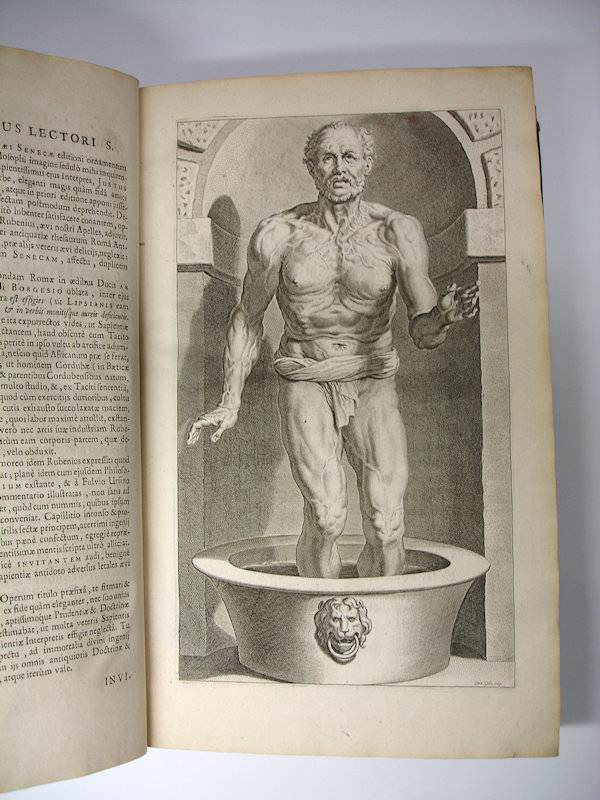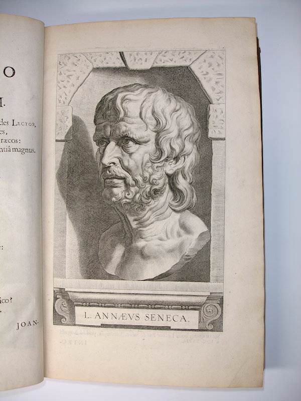Folio. (XVI),XXXVI,911,(1 blank) p.; portrait of Lipsius; engraved title; a bust of Seneca, and a plate of Seneca standing in a tub, both plates by C. Galle after Rubens. Calf 41 cm. (Ref: STCV: 6608951; Schweiger 2,902: ‘Gesuchteste Ausgabe des Lipsius, aber nicht weiter als Wiederholung der von 1632’; Brunet 5,276/77: ‘Édition estimée. Les 3 premières éditions, Antverpiae, ex off. Platiniana, 1605, 1615 et 1632 sont moins complètes.’; Dibdin 2,397: ‘excellent notes of Lipsius’; Moss 2,578: ‘it is certainly a very elegant publication’; Fabricius-Ernesti 2,115; Ebert 20860: ‘Beste und gesuchteste der von Lipsius besorgten Ausg.’; Graesse 6/1, 348/49: ’très recherchée’; Spoelder 642, Middelburg 4) (Details: Prize copy, but lacking the prize. Gilt back with 7 raised bands, red morocco shield in the second compartment. Borders of both boards gilt, and with the coat of arms of Middelburg in the center. Portait of Lipsius engraved by Cornelius Galle. Engraved architectural title, the text of it is flanked by the statues of Greek philosopher Zeno, the founder of the Stoic school, whose doctrine of suicide as a ‘reasonable exit’ from life in response to incurable disease or inexorable pain Seneca accepted, and Zeno’s pupil Cleanthes; in the upper frieze reside pictures of Hercules, Pallas and Ulysses, at the feet of Cleanthes and Zeno are the portraits of Seneca and Epictetus. The full page ‘Seneca standing in his bath’, is engraved by Cornelius Galle, and made after the famous painting of Rubens, ’the death of Seneca’. The full page portrait of Seneca was engraved after a drawing of Rubens. A smaller engraved portrait of Seneca, 11.5×13.5 cm, on page XXIV after the Italian scholar and antiquarian Fulvius Orsinus (imago quae a Fulvio quidem Ursino prodita est). Woodcut initials. § The ‘Officina Plantiniana’ issued 2 ‘Opera’ editions of Seneca in 1652. This is the second issue, probably printed by Petrus III Bellerus for Balthasar Moretus. Bellerus printer’s device is found on f. X6 verso and f. Y4 recto) (Condition: Binding somewhat scuffed and scratched. Front joint beginning to split. Head and tail of the spine chafed. Corners slightly bumped. The school prize has been removed. Edges of both flyleaves browning. Some leaves yellowing, a few are browning. Faint waterstain in the right margin of the last 6 gatherings) (Note: The Roman philosopher and politician Lucius Annaeus Seneca, ca. 4 BC – 65 AD, has ever since antiquity been controversial. He was ‘attacked for his Latin style, his political compromises, and his wealth. (…) Seneca (…) devoted himself to philosophy, finally being charged with complicity in the conspiracy of Piso in 65. His suicide (ordered by Nero) is described by Tacitus (…). The death scene, ‘imago vitae suae’, ’the image of his life’, has been a significant element in Seneca’s influence on posterity. (…) His style was urgent, colourful and pointed, appropriate for the fragmented ethical and political ambiguities of his time, and it ultimately proved to be an effective vehicle for the Latin Church Fathers’. (‘The classical tradition’, Cambridige Mass., 2010, p. 873) By the 4th century Seneca’s reputation, as an author and as a philosopher, had recovered. He is praised by Boethius (d. ca. 524), and has through the works of Cassiodorus (d. ca. 585) and Martin of Braga (d. ca. 579) influenced medieval and Renaissance philosophy. From the 13th century onward he was widely read, especially after the invention of printing. A Senecan Renaissance was advanced with the editions of Erasmus, who did much to improve the text. Seneca’s reputation was further enhanced by the magnificent edition of his ‘Opera’, produced by the Flemish scholar Justus Lipsius, and published in 1605 by the Flemish ‘Officina Plantiniana’, lead by Balthasar Moretus. This edition and the later ones of 1615, 1632 and 1652 were adorned with elaborate title pages and portraits engraved by T. Galle and C. Galle. The worth of Lipsius’ editions lies in the preface and commentary. ‘His commentary, while economical by modern standards, was fuller than that by Erasmus. Lipsius died before he could finish his commentary on ‘Quaestiones Naturales’. The first edition of Lipsius’ Seneca (1605) included a commentary by M.A. Muretus (d. 1585), replaced by that of Libertus Fromond in later editions. The introductory paragraphs to each section of Seneca’s prose were lucid, concise, and often enthusiastic. ‘Legite iuvenes senesque!’ is a frequent exhortation, typical of Lipsius’ primary goal, which was to teach’. (Idem, p. 875) ‘Moretus had been Lipsius’ student, and he was a friend of Peter Paul Rubens whom he commissioned to design, for the 1615 edition and its successors, a portrait of Lipsius and two full-page engravings of Seneca, one of an ancient bust believed to be of Seneca, and owned by the artist, and the other of Seneca entering the bath in which he died. The latter engraving was related to Rubens’s 1608 painting of Seneca’s death, which further spread the fame of Seneca as a martyr to tyranny who died true to his philosophical principles’. (Idem, ibidem) § Justus Lipsius, the greatest Latin scholar of his time, came in 1579 to the recently founded University of Leyden (1575) to teach Latin. He resided there with great distinction as honorary Professor of History from 1579 till 1591. According to J.E. Sandys his greatest strength lies in textual criticism and exegesis. (J.E. Sandys, History of Classical Scholarship, N.Y., 1964, vol. 2, p. 303). Lipsius edited only Latin prose writers. He was not attracted to Latin verse. The ‘Opera omnia’ of this edition do not include Seneca’s tragedies) (Collation: (*)-2*4, A-C6, A-4G6 (leaf 4G6 verso blank); leaf *1 portr. Lipsius, *2 engraved title, 2*3 Seneca in bath, 2*4 bust of Seneca) (Photographs on request) (Heavy book, may require extra shi