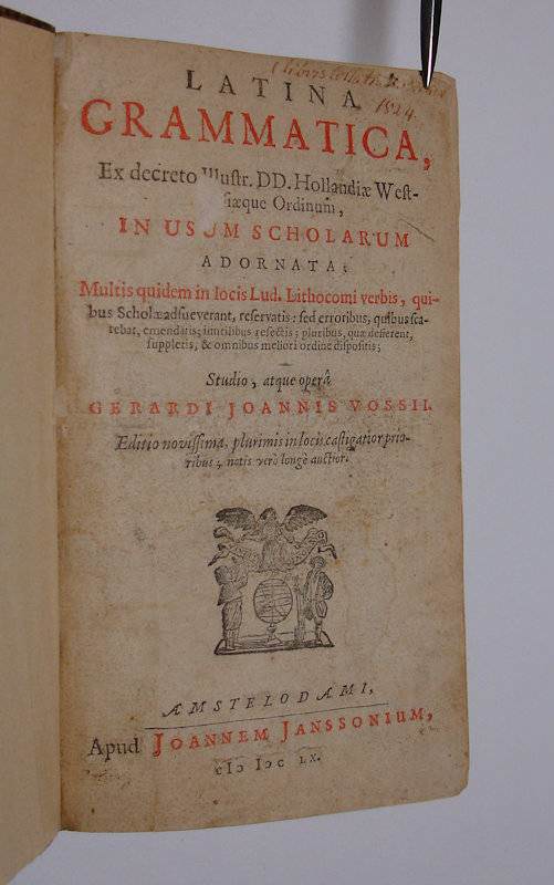 3 volumes in 1. (VIII),175,(1 blank);176 p. Eighteenth century boards. 16 cm (Details: First title printed in red & black. Woodcut printer’s mark on all 3 titles, depicting a farmer and a man with a Jacob’s staff before his eye, between them a celestial sphere, above them Fama blowing 2 trumpets, motto: ‘Vivitur ingenio’, short for ‘Vivitur ingenio, caetera mortis erunt’, ‘one lives on by the spirit, the rest shall belong to death’) (Condition: Cover scuffed and worn at the extremities. First title dustsoiled, with an ownership entry on the blank upper margin; a very small spot (0.5×1 cm) on the title superficially worn away. 2 small biographic clippings neatly tipped in on the front pastedown. A few old ink underlinings. One marginal well succeeded paper repair. Library stamp on verso of title. Paper yellowed) (Note: This Latin grammar was commissioned in 1625 by the Provincal Governments of Holland and West-Frisia (Staten van Holland) for the use in local Latin schools in the Western part of the Dutch Republic. It was produced by the Dutch classical scholar Gerardus Johannes Vossius, 1577-1649, according to Sandys the greatest polyhistor of his age. In 1622 he was appointed professor of Eloquence at Leyden, and in 1631 he accepted the professorship of History at Amsterdam. His Latin grammar remained the standard grammar on Dutch schools untill the middle of the 19th century. In 1625 the ‘Staten van Holland’ decreed, that the same set of rules should apply to all public schools in their provinces. The schools should have the same order of classes and lessons, the same schedule, authors and exercises. It was decided that uniform schoolbooks, grammars and sound texts were needed. (E.J. Kuiper, ‘De Hollandse ‘Schoolordre’ van 1625′, Groningen, 1958, p. 80) The ‘Staten of Holland’ wanted to improve education at the Latin-schools, which prepared for the University, for the standard of education and discipline had got worse because of the Eighty Years’ War. The grammar was first published in 1626, and found the next 2 centuries numerous new and revised editions. The first volume contains the latina etymologia, the second the latina syntaxis, the third the latina prosodia) (Provenance: Library stamp on verso of title: ‘Grosherzogliche Bibliothek Neustrelitz’. ‘Die 1796 gegründete Herzogliche, später Grosshezogliche Bibliothek Neustrelitz umfasste zunächt die private herzogliche Büchersammlung und enthielt 1829 etwa 50.000 Bände. Dieser Bestand wurde in den nächsten 50 Jahren kaum vergrössert. (…) Für 1875 werden sehr unsicheren Schätzungen – die Bibliothek war unterbesetzt – 60.000 bis 70.000 Bände angegeben, erst ab 1894 erhöht sich diese Zahl auf 100.000. Obwhol der Philologe Friedrich Latendorf (1831-1898) den Wert der Bibliothek für das geistige Leben des Landes immer wieder betonte (…) musste er feststellen, dass wichtige Werke fehlten, Disziplinen wie Medizin und Juristerei fast völlig vernachlässigt waren und der Bibliothek seit ihrer Gründung der Charakter des Zufälligen anhaftete’ The schoolboy Heinrich Schliemann saw in the underpaid librarian Carl Andress, ‘der offenbar kein abgeschlossenes Studium (Literatur, alte und neue Sprachen) besass’, ‘einer der gelehrtesten Männer Deutschlands’. (U. Hass-Zumkehr, ‘Daniel Sanders: Aufgeklärte Germanistik im 19. Jahrhundert’, Berlin/New York 1995, p. 307/08) The library had in 1920 132.000 volumes. In 1950 the library was ‘aufgelöst und ihre Bestände auf acht Bibliotheken und Museen in Schwerin, Greifswald, Rostock und Berlin aufgeteilt worden. Mit dieser Aktion ging der betroffenen Region eine unersetzbare Quelle der kultur- und regionalgeschichtlichen Forschung verloren’. (B. Fabian, Handbuch der historischen Buchbestände in Deutschland (online)) (Collation: *8, A-L8 (leaf L8 verso blank); a-l8) (Photographs on request)