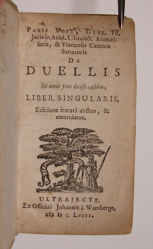 12mo. (VIII),384 p. Vellum. 14 cm (Details: 5 thongs laced through the joints. Woodcut printer’s mark on the title, depicting Pallas Athena under an apple tree, motto: ‘Et flore et fructu’) (Condition: Vellum soiled and spotted. Fading manuscript title on the back. Front flyleaf removed) (Note: The Dutchman Paulus Voet, latinized as Paulus Voetus, or Voetius, 1619-1667, was a jurist, classical scholar and philosopher. In 1640 he took his Magister’s degree, and was appointed a year later professor extraordinarius of Metaphysics at the University of Utrecht. There he showed himself an opponent of the philosophy of René Descartes. In the meantime he studied law, and got his law degree in 1645. A professorship of Logic and of Greek was offered to him in 1648. In 1645 he had already published his ‘In Herodiani Marcum et Commodum Notae’. From 1652 he lectured also on law. He was a member of the Chamber of Justice in the nearby city of Vianen. As a professor of law he has laid with his publications the foundations of international private law, as he dealt with the question why a sovereign state should apply foreign law on its territory. In 1646 Voet published the first edition of his work on duels ‘De duellis licitis et illicitis, liber singularis’, in which he examined the phenomenon insult and duel. In 1658 he published a second revised and augmented edition. Voet furiously opposed duelling. Duellist were in his opinion rather meticulosi than audaces, men full of fear instead of audacia, courage and intrepidity. It would be better if unworthy revilers, who insulted men of honour, would not be given the opportunity to duel, but would be punished with infamia, disgrace. If this was done ‘non adeo audacter & licentiose conviciatores, qui responso digni non sunt, in virorum bonorum famam grassarentur’. (p. 310) In chapter 35, the last chapter, which is on slander, he reveals his own involvement. Voet tells how his father and he were once the victim of slander. (p. 311/13) He reminds there how the Dukes of Brabant, in order to prevent duelling, proclaimed ‘se offenso honoris reparationem curaturos’, that they would secure the honour of those insulted. (p. 319) If someone had dealt another soldier a box on the ear (alapa, colaphus), he would receive a box on the ear or a kick in front of his batallion (in presentia cohortis), would be disarmed, and then be sacked) (Provenance: On the front pastedown: ‘Delfosse, 1769) (Collation: *4, A-P12, Q8, R4) (Photographs on request)