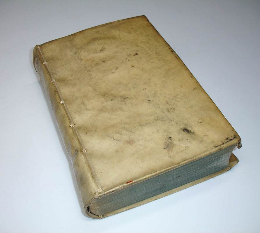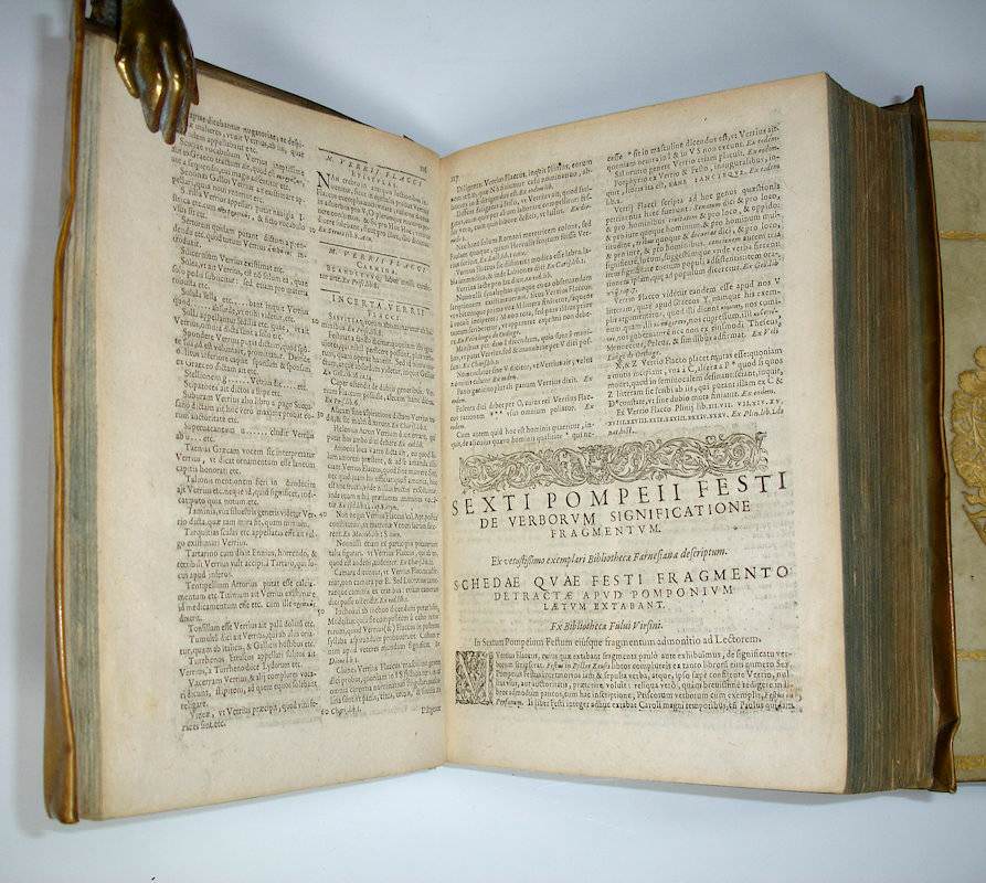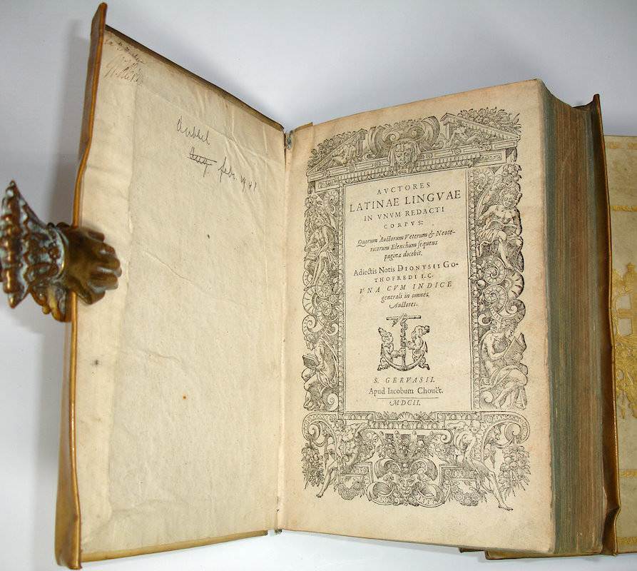 4to. (VII),(1 blank) p; 1924 (recte 1926) columns, (1 blank) p.; (74 index) p., (2 blank) p.;106 (recte 74) columns. Overlapping vellum 26 cm (Ref: Schweiger 2,1297; Graesse 1,250; Ebert 8793; Brunet 1,548/49) (Details: 7 thongs laced through the joints. The title page has woodcut architectural borders filled with floral motives and human figures, 2 reading men are flanking the title on each side, at the foot two naked athletes, at the top a tympanon. Woocut printer’s device on the title, depicting an kind of Nehustan anchor, held by 2 hands emerging from a cloud; around the upperpart of the anchor coils a snake) (Condition: Vellum age tanned and somewhat soiled. Front flyleaf gone. Title page dustsoiled and slightly thumbed. Paper yellowing) (Note: This collection of works of ancient Latin grammarians of 1602 is a reissue of an edition which was published in 1585 in Geneva by the French scholar Dionysius Gothofredus, or Denis Godefroy, 1549-1622. It contains works of great importance in the history of linguistic studies. During the Renaissance a renewal of interest in Latin grammar occurred. Language theory became a linguistic research subject. Medieval vocabulary and terminology, and sloppy grammar were rejected, and the primary of the Latin of the classical period was reasserted. This process was stimulated by the gradual rediscovery of previously unknown texts of classical authors, among whom Varro’s ‘de lingua Latina’, with which this collection opens, was one of the most important. § Dionysius Gothofredus is best known as the editor of the monumental ‘Corpus iuris civilis’, Lyon 1583, an edition with commentary of the complete collection of fundamental works in Roman jurisprudence (Digest, Institutions, Codex, Novellae) issued on order of the emperor Justinian at the beginning of the sixth century. Gothofredus’ edition made history. He did not only coin the title ‘Corpus Juris Civilis’, but it was issued more than 50 times, with or without commentary and glossae. Gothofredus studied law at Louvain, Cologne, and Heidelberg, and then returned to Paris, his hometown, to work as a solicitor. But being protestant he had however to leave France in 1579, escaping civil war and persecution, and fled to Geneva. There he was professor of Roman law for the next ten years. In 1589 he was called back by king Henry IV, but the next year he had to flee the country again. His house and library were plundered. In 1590 he took refuge in Basle. In 1591 he accepted a professorship of Roman law in Strassburg. From there he moved in 1604 to the university of Heidelberg, where he became head of the faculty of law. Gothofredus also worked on classical authors such as Cicero and Seneca and the ancient Latinn grammarians, and on ancient history. § The edition contains: Varro’s ‘De lingua Latina’, Verrius Flaccus’ ‘Fragmenta’, Festus, Nonius Marcellinus, Fulgentius Placiades, Isidorus’ ‘Libri XX Originum’, ‘Ex veteribus grammaticis, qui de proprietate & differentiis scripserunt’, ‘Vetus kalendarium Romanum’, ‘De nominibus & praenominibus Romanorum’, ‘Varii auctores qui de Notis scripserunt’, ‘Notae Dionysii Gothofredi ad Varronem, Festum, Nonium & Isidorum’, ‘Variae lectiones in Fulgentium & Isidorum’, ‘Liber glossarum ex variis glossariis, quae sub Isidori nomine circumferuntur collectus’, ‘Excerpta Pythoeana ex veteribus glossis’, and ‘Excerpta differentiarum Bongarsii Regii legati’) (Provenance: On the front pastedown in old ink: ‘Ex Bibliotheca W. Klerk’) (Collation: §4 (leaf §4 verso blank), A-3B8,3C4,3D-3T8 (leaf 3T8 blank), 4A-4B8, 4C4) (Photographs on request)