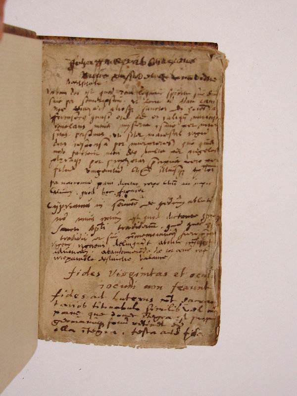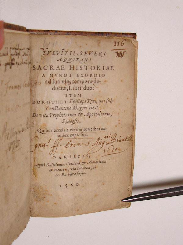 Small 8vo. (XXXII),156,(2 blank);(24 index) p. Modern hardbound binding. 13.5 cm ‘A universal chronicle which is an important source for the history of 4th-century events’ (Ref: USTC 153005; Ebert 22005; Schoenemann 2,378/79) (Details: Back with 4 raised bands, and with a gilt short title in the second ‘compartment’) (Condition: Old inscriptions on the front flyleaf. Front flyleaf worn, thumbed and dustsoiled. Title also thumbed and dustsoiled, and with an old ownership entry and shelf number) (Note: The Latin historian Sulpicius (or Sulpitius) Severus was born in Aquitania ca. 360 A.D. He organized under the influence of Bishop Martinus of Tours a sort of monastic life on his own estate for himself and his friends. His extant works are a ‘vita S. Martini Turonensis’, and this ‘Sacrae Historiae’, a kind of universal chronicle to A.D. 402, ‘which is an important source for the history of 4th-century events, (…). The whole book is an interesting attempt to present a ‘breviarium’ of history from the Christian point of view: it uses Christian chronographers, especially St. Jerome, but also Pagan writers. J. Bernays suggested that for the destruction of Jerusalem in A.D 70 Sulpicius followed the lost account of Tacitus. Sallust and Tacitus are his models in the matter of style’. (OCD, 2nd 3d. p. 983) § The ‘Sacrae Historiae’ were first published in Basel in 1556 by the Ilyrian protestant scholar Mat(t)hias Flacius, the latinized slavic name Vlacich, from a old manuscript found in a library in Hildesheim. Flacius, 1520-1575, who taught Hebrew in Wittenberg and the New Testament in Jena, was a pupil and lifelong supporter of Luther. Flacius dedicated his book to the Polish duke Nicolaus Radziuilius, who was a great patron of the Lutherans. (Neue Deutsche Biographie 5 (1961), p. 220-222) Schoenemann’s opinion is that Flacius ‘accurata fide hos libros exprimendos curavit’. (Schoenemann p. 378) The next edition of the ‘Sacrae Historiae’, this edition, appeared a few years later, in Paris in 1560. In the 32 page ‘praefatio’ to this edition, which is in fact a ferocious attack against Lutheranism, that brought nothing but ‘latrocinia, furta, praedationes, adulteria, usurae, homicidia & id genus alia flagitia’ (p. 2* recto), written by one ‘Iacobus Faber doctor theologus, Sorbonicus’ we are told that he (Faber) published this work to strengthen the spirit of the Catholics against the heresy of the Reformation, that was raging through Europe, and especially Germany. (p. *3 recto) Faber suggests that he found and edited the text of the ‘Sacrae Historiae’ himself. (‘cuius sacram historiam cum in publicum omnium catholicorum commodum evulgare ex mediis antiquorum seculorum abditissimis scriniis erutam cogitaremus’, p. 2*3 recto & verso) Schoeneman explains that the catholic professor of the Sorbonne was a common thief, who misappropriated the edition of his protestant precursor Flacius, without any acknowledgment. (‘partam Matthiae Flacio gloriam suffurari non erubuit’, Schoenemann p. 379). Schoenemann calls the praefatio of Faber nothing but ‘emendicatus pannus’, ‘begged for rags’ (pun for ‘emendicatus panis’?) (Provenance: On the title: ‘Conv.s ff. erem. s. Aug.ni Bruxell. 1610’, indicating that the book once belonged to the convent of the Order of the Eremites of St. Augustine in Brussels. § On the front flyleaf the old names: ‘Van den Boom’, and ‘P. v(an)d(en) Hoogen ex Horsten, 18/12/’25’) (Collation: *-2*8, A-T8, V4 (last leaf V4 blank), +8, 2+4)(Photographs on request)