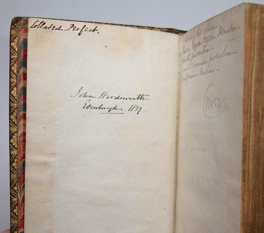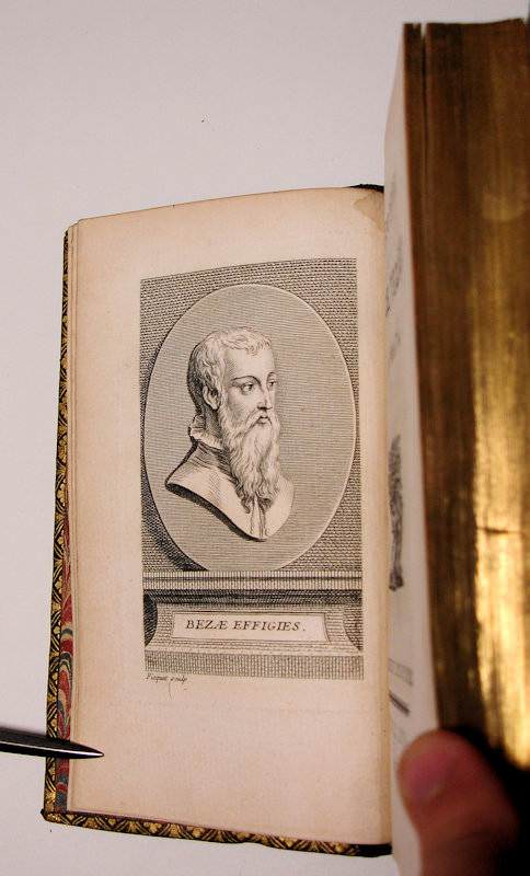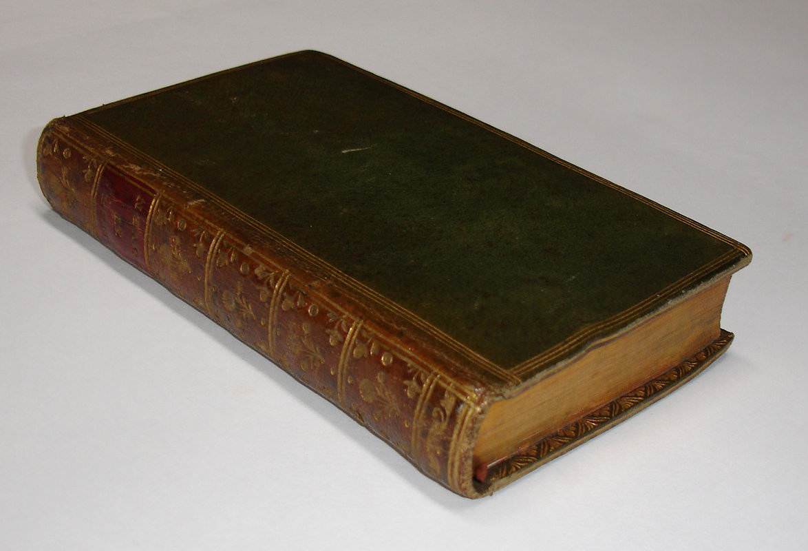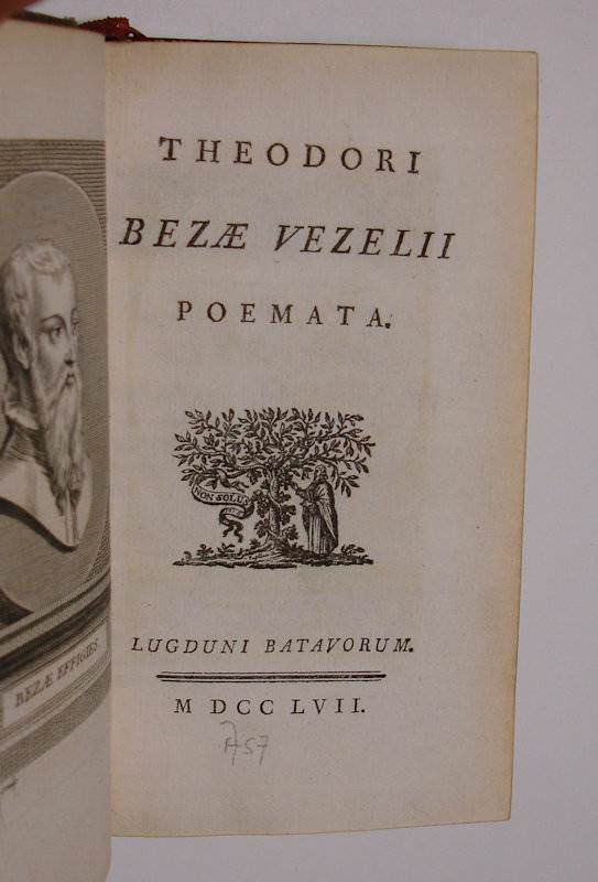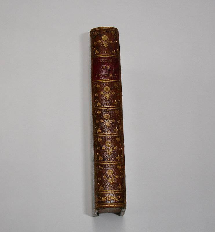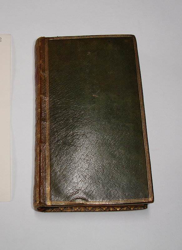 12mo in 8 & 4 sheets. 3 volumes in 1: (IV),IV,124 p., a portrait of Beza; X,106 p., a portrait of Muretus; IV,3-156 p. Green morocco 16 cm (Ref: Brunet 1,239; Graesse cf 1,359, where we find the imprint Paris 1757) (Details: Green morocco; red morocco shield on the back; gilt floral decoration on the back; boards with gilt triple fillet borders; inside dentelles gilt; marbled endpapers; edges of the bookblock gilt; woodcut printers’ mark of Joseph Gérard Barbou on all three titles, depicting an old man who stands in the shade of a vine-entwined elmtree. The motto is ‘Non solus’. The 2 portraits have been etched by Fiquet) (Condition: Some wear to the extremes. A small bump in the bottom edge of the front board. Two tiny and almost invisible wormholes in the front joint) (Note: All three titles in this book have a false imprint, ‘Lugduni Batavorum’, i.e. Leiden, in the Dutch Republic. It was according to Brunet actually published in Paris by Barbou. He does not explain, but the printer’s mark, paper, printing and layout looks indeed very Barbou. The Short Title Catalogue Netherlands (STCN) is not sure either about Leiden, it adds ‘printed in France?’ § In Latin elegiac and epigrammatic poetry, from Roman times to the Renaissance, there is constant reference to the ‘poetry of youth’, as ‘standing in contrast to a kind of poetry suitable to be written in old age. The poets characterize the latter poetry as serious, moral, and austere, touching on wars and politics and patriotism. The former is filled with passion and exuberance, concerned not with weighty national issues, but with jokes and laughter and erotic affaires’. (K.M. Summers, ‘The Iuvenilia of Marc-Antoine Muret’, Columbus, 2006, p. XXV-XXVI) § The first edition of ‘poemata juvenilia’ of the young Calvinist theologian Theodore de Bèze, or Theodorus Beza, 1519-1605, was published in Paris in 1548. ‘It had certain rather free pieces printed, which were afterwards made a matter of bitter reproach against him. He therefore suppresed them in the following editions’. (Ebert) This first edition, including the erotic love poems which Beza later regretted having ever published, was clandestinely reprinted. Beza was considered to be among the best Neo-Latin poets of his time. He is however best known for his Latin translation of the New Testament, his critical Greek edition of the New Testament, and for being the founder of the University of Geneva. § The Frenchman Marc Antoine Muret, latinized as Marcus Antonius Muretus, 1526-1585, ‘exemplifies the essence of French Renaissance humanism. A master of Latin and student of Classical Antiquity, he not only engaged in the recovery and exposition of ancient texts, he also actively employed the old genres and skills in the contemporary ecclesiastical and public spheres. He wrote Latin poetry, both sacred and profane, delivered public orations in Latin and lectured in various schools throughout France and Italy on authors as diverse as Catullus and Tacitus and on topics as varied as Greek philosophy and Roman law’. (K.M. Summers, ‘The Iuvenilia of Marc-Antoine Muret’, Columbus, 2006, p. XIII) His ‘Iuveninlia’ were first published in 1552. § The Dutch neolatin poet Janus Secundus Nicolai Hagiensis, was born on the 15th of november 1511, the day of the martyr Secundus, in The Hague. He died very young in 1536. In 1528 he moved to Mechelen, the residence of the Austrian vicequeen Margaretha of Parma. The southern part of the Netherlands was in this time the center of a florishing urban civilization. In May 1530 Secundus met a young prostitute from Mechelen, called Julia, and fell in love with her. Julia became the subject of his first book of elegies, his ‘Julia Monobiblos’, in which he tells how he won and lost his love. During his studies in Bourges under the famous jurist Alciati he wrote his first ‘Basia’. Alciati introduced Secundus there also to the newest Italian poetry. A humanist poet often started his career with erotic poetry, like Piccolomini and Beza. Secundus’ ‘kiss-poems’ are a variation on two ‘kiss-poems’ of the Latin poet Catullus (ca. 84-54 B.C), who became during the Renaissance a model for love-poetry. Secundus wrote in his short life 6835 lines of poetry, of which only 425 lines were printed during his lifetime. He wrote ‘with equal fluency all kinds of lyrical, heroic, and elegiac verse. Down to the present day Secundus lives in literary history as the kissing poet’ (…) ‘Until far in the 18th century Secundus is mentioned as one of the classics of love poetry’ (IJsewijn, Companion to Neo-Latin studies I, Leuven, 1990, p. 152) The first edition of his collected works was posthumely published in 1541 in Utrecht, and was edited by Secundus brother Marius. § After the poems of Janus Secundus we find 46 pages with the ‘Pancharis Joan. Bonefonii Averni ad Jacobum Guellium (p. 111-156)) (Provenance: On the verso of the front flyleaf: ‘John Wordsworth, Edinburgh, 1827’. This is the English classical scholar John Wordsworth, 1805-1839, nephew of the Romantic poet William Wordsworth. ‘In October 1824 he entered Trinity College, Cambridge. His university career was distinguished. In 1825 he obtained the Bell scholarship, in 1826 a scholarship at his own college, and was second for the Porson prize; in 1827 he obtained it. In 1828 he proceeded to the B.A. degree, but was disqualified for classical honours through distaste for mathematics. In 1830 he was elected fellow of his college. (…) In 1834 he was appointed a classical lecturer in Trinity College, and undertook to edit Richard Bentley’s Correspondence (afterwards completed by his brother Christopher Wordsworth’. (Source Wikipedia)) (Collation: pi4 (plus portrait); A8, B4, C8, D4 etc., K4, L2; Portrait, A8 B4, etc. X8, Y4) (Photographs on request)