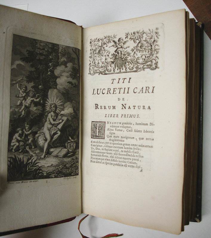 12mo. XXXVI,288 p., frontispiece and 6 plates. Later half morocco. 17.5 cm (Ref: Gordon 504B; Ebert 12455; Brunet 3,1220; cf. Schweiger 2,576 for the ed. of 1744; Graesse 4,280) (Details: Nice copy. Red morocco, first half 20th century. Back with 4 raised bands, with gilt fillets and lettering. Marbled boards and endpapers. Thick paper, wide margins, untrimmed. Fine engraved frontispiece and plates designed by Frans van Mieris junior, engraved by Cl. Duflos for Coustelier in 1744, and used again by Barbou for this edition. For an explanation of these mythological plates see the bibliography of Gordon, p. 244. Woodcut printer’s mark on the title, depicting an old man who stands in the shade of a vine-entwined elmtree, symbolising the symbiotic relationship between scholar and publisher. The motto is enigmatic: ‘Non solus’, probably indicating the interdependency of publisher and scholar. Occasional engraved headpieces and woodcut initials. Includes also a tricolour bookmarker. At the end 30 pages filled with ‘Variae Lectiones’) (Condition: Some negligible wear to the corners; a hardly visible dent at the lower edge of the front board) (Note: The Roman poet and philosopher Lucretius was much admired in the age of Enlightenment. ‘Virtually every major figure of the period was in some way influenced by Lucretius’. (S. Gillespie and Ph. Hardie, Cambridge Companion to Lucretius, 2007, p. 274). He acted as shield-bearer and mouthpiece of the Greek philosopher Epicurus by explaining in his didactic poem ‘De rerum natura’ Epicurus’ physical theories ‘with a view to abolishing superstitious fears of the intervention of the gods in the world and of the punishment of the soul in an after-life’. (OCD 2nd ed. p. 623) § This is a line for line re-edition of the Lucretius edition of 1744, published in Paris by A. Coustelier. It was edited by the French scholar Étienne André Philippe de Prétot, 1707-1787. He taught history and geography at the Royal Academy in Paris, and produced for the publisher Coustelier a great number of editions of Latin classics, especially poets and historians. He published also on Roman history, and on geography. He was not an accomplished philologist, so he borrowed the texts for his editions from standard works. In this case he used the text of the edition of the Dutch classical scholar S. Haverkamp, 1684-1742, which was published in quarto, Leiden 1725. Dibdin calls the edition of Haverkamp ‘not only a very splendid, but a learned and critical edition’. (Dibdin 2,202/3). Ernesti calls it ‘splendissima’ (Ernesti, 1,83). Mr. Philippe not only borrowed the text, but his edition is also adorned with the same charming plates as that of Haverkamp, only expertly reduced) (Collation: frontispiece, a8, b4, c6; plate, A8, B4, C8, plate, D4, E8, F4, G8 (plate after G5), H4, I8, K4, L8 (plate after L1), M4, N8, O4, Plate, P8, Q4, R8, S4, T8 (plate after T1), V4, X8, Y4, Z8, Aa4) (Photographs on request)
