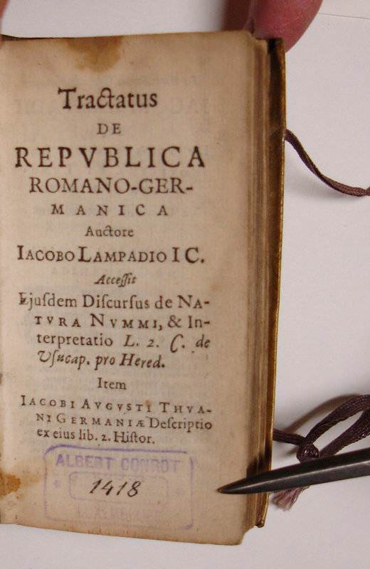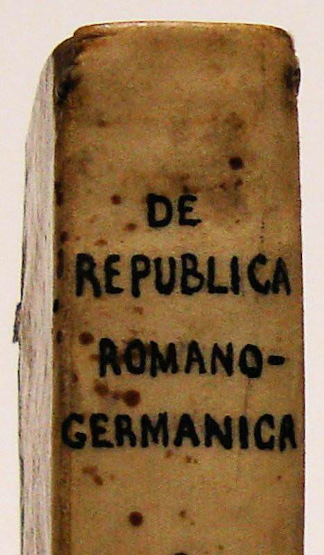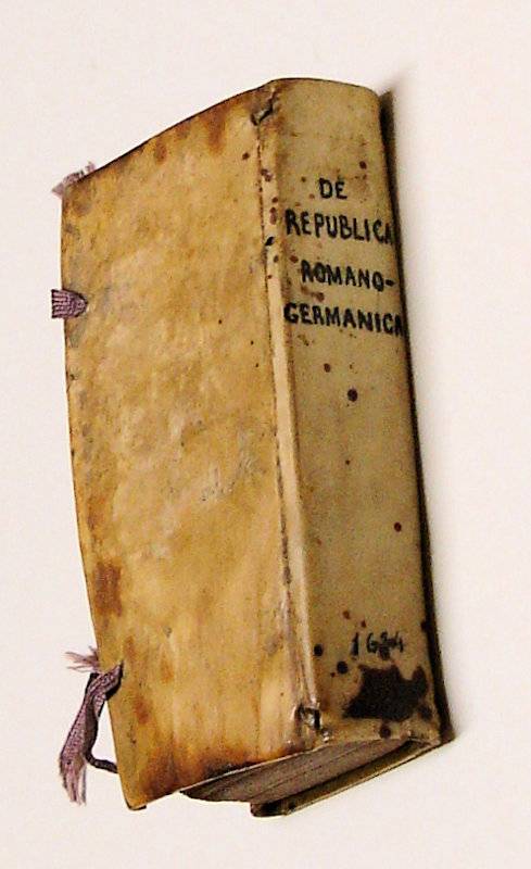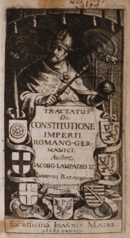 24mo. 380 p., engraved title. Overlapping vellum 11 cm (Ref: Breugelmans p. 364, 1634:4) (Details: 2 thongs laced through the joints. Short title in ink on the back. The engraved title depitcts the emperor of the Holy Roman Empire on his throne, with his regalia. The lower part of the title is adorned by 7 coats of arms of German states) (Condition: Vellum age-tanned. Ink stain on the back. Small inscription on recto of front flyleaf. Upper margin of the title slightly stained, and showing an old ownership entry. A small stamp on the lower margin of the recto side of the second leaf. Four new brown ribbons attached to the covers) (Note: The German diplomat and jurist Jacobus Lampadius (Jakob Lampe), 1593-1649, conducted a lively correspondence with Conring, Althusius, Grotius, Georg Calixt et alii. His theory of constitutional law, which contributed to the further development of the prevailing dualism in the Holy Roman Empire into a system of federate states in accordance with a shared sovereignty between the Emperor and the German lands, has become, with adaptions to the peace of Westphalia of 1648, which ended the thirty years’ war in Germany, made by Conring and later by Kulpis, a widely read standard work on the constitutional relations in Germany during the second half of the 17th century. It was first published in 1621 as ‘Dissertatio de jurisdictione in Imperio nostro Romano-Germanico’. H. Conring (Conringius) produced in 1630 an augmented and revised edition under the title of ‘De constitutione reipublicae Romano-Germanicae’. The Leiden publisher Maire brought Conring’s edition on the market as ‘Tractatus de Constitutione Imperii Romano-Germanici’. (NDB 13, 454/56)) (Provenance: On the front flyleaf: ‘C. desars, 1654’. This name is repeated in smaller type on the title. On the verso of the title in faint ink: ‘Ex libris Jacobs’. On the recto of leaf A2 a small stamp: ‘Albert Conrot, Luxembourg’. On the internet we found one Albert Conrot, ‘industriel à Luxembourg’, corresponding member of the ‘Institut Archéologique de Luxembourg’. He died in 1904) (Collation: A-2A8 (minus the blank leaves 2A7 & 2A8) (Photographs on request)