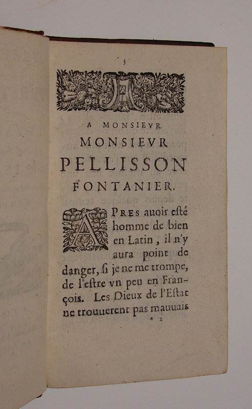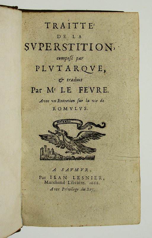 12mo. 52,117,(3) p. Calf 15 cm (Ref: Hoffmann 3,217; Graesse 5,369) (Details: Back with 4 raised bands; back and borders of the boards ruled blind. Woodcut printer’s mark on the title of Jean Lesnier, it depicts an eagle that soars above a city; in its beak a banner with the motto ‘movendo’. Woodcut headpieces and initials. Paper of excellent quality) (Condition: Binding a bit chafed, and slightly worn at the extremities. Tear in leaf A4) (Note: The Greek philosopher, historian and educator Plutarchus of Chaeroneia was born before 50 A.D., and died after A.D. 120. He is our most important witness of the spiritual climate of the first and second century A.D. He wrote numerous short treatises of popular moral philosophy, which go under the general name of the Moralia. They include debating themes, works in the form of question and answer, and serious discussions of philosophical topics. His warm and sympathetic personality can be traced in many treatises, which contain also a great deal of antiquarian knowledge picked up by Plutarchus in the course of his wide reading. (H.J. Rose, A Handbook of Greek literature, London 1965, p. 408). The Moralia were very influential in the Renaissance. ‘It is no exaggeration to say that Renaissance and early modern Europe discovered Greece and Rome through Plutarch’s eyes’. (The Classical Tradition, Cambr. Mass., 2010, p. 748). § Since the Plutarch edition of 1572 of Henri Estienne (Henricus Stephanus) the 76 treatises of the Moralia are divided into 14 books, and the Latin titles he gave to the treatises are still in use today. Our book is a translation into French of the 14th treatise, Plutarch’s essay on Superstition, ‘De Superstitione’, ‘?e?? de?s?da?µ???a?’ (Moralia, Book 2, 164E-171F). It is an attempt to prove that superstition is a dangerous venom, and far worse than atheism. Plutarch argues that the ‘atheist, when he is ill, takes into account and calls to mind the times when he has eaten too much or drunk too much wine, also irregularities in his daily life, or instances of over-fatigue or unaccustomed changes of air or locality; and again when he has given offence in administering office, and has encountered disrepute with the masses or calumny with a ruler, he looks to find the reason in himself and his own surroundings: Where did I err, and what have I done? What duty of mine was neglected? But in the estimation of the superstitious man, every indisposition of his body, loss of property, deaths of children, or mishaps and failures in public life are classed as ‘afflictions of God’ or ‘attacks of an evil spirit’. For this reason he has no heart to relieve the situation or undo its effects, or to find some remedy for it or to take a strong stand against it, lest he seem to fight against God and to rebel at his punishment; but when he is ill the physician is ejected from the house, and when he is in grief the door is shut on the philosopher who would advise and comfort him’. (Babbit’s translation of 168B-C in the Loeb Classical Library edition of the Moralia, 1928) § The treatise, which Faber calls ‘un des plus excellens traittés qui’ait iamais fait Plutarque’, (Préface p. 22) was translated by the French scholar Tanneguy Le Fèvre, latinized as Tanaquil Faber, 1615-1672, who was from 1665 ‘professeur de grec de l’Académie protestante de Saumur’. Faber was a diligent editor of Greek and Latin texts. He opposed contemporary superstition, which he calls ‘une maladie de l’ame’. (Préface p. 19) He considered atheists ‘irreligieux’ (…) gens sans religion’. (Idem p. 35). Faber is famous because of his daughter Anne, who married in 1664 the learned printer Jean (de) Lesnier, 1639-1675, when she was seventeen years old. So De Lesnier, who was printer for the protestant academy of Saumur, printed and published this translation for his father in law. After the publisher’s early death in 1675, Anne, widowed at the age of 28, married in 1683 André Dacier, pupil of her father, and became a respected classical philologist herself under the name of ‘Madame Dacier’. The work seems to be rare; we found in KVK only a few copies) (Collation: *-2*12, 3*2, A-E12) (Photographs on request)
