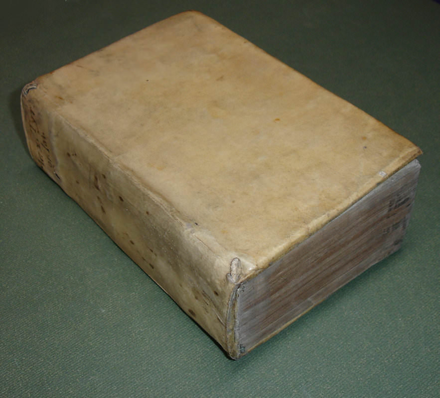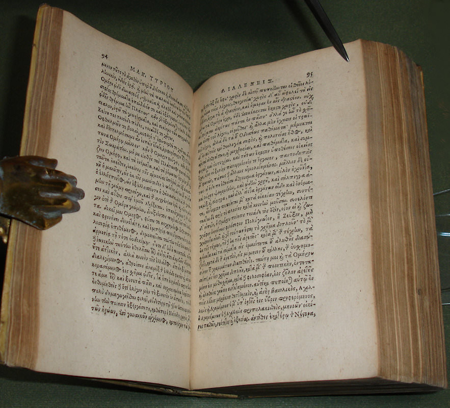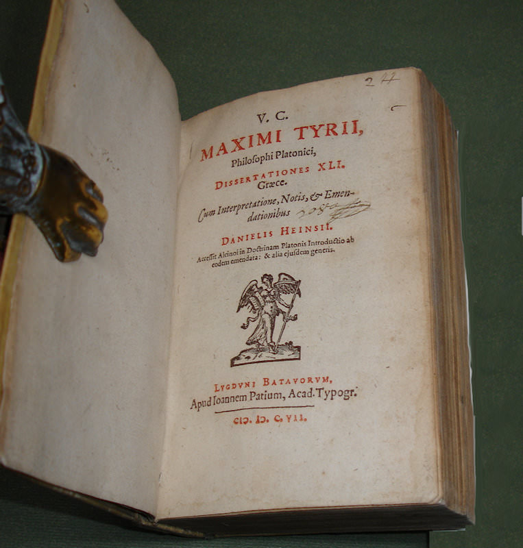 8vo. 3 parts in 1: (XXIII),(1 blank),408; (12),411,(4),(1 blank); (159 unnumbered pages),(1 blank) p. Vellum 17.5 cm (Ref: Hoffmann 2,585; Schweiger 1,204; Dibdin 2,232; Graesse 4,453; Ebert 13450; Brunet 3,1552) (Details: Two thongs laced through the joints. Each part has its own title, the first is in red & black. Woodcut printer’s mark of Paets on the titles, depicting a winged young woman who holds a scythe in her left hand and an opened book in her right arm) (Condition: Vellum age-toned and spotted. Tiny hole in the vellum of the lower board. Both pastedowns detached. Bookplate pasted on inside of the upper board. First title finger soiled. Almost invisible pinpoint wormhole at the tip of the right upper corner of ca. 250 p. Paper yellowing) (Note: The Greek Platonist Maximus Tyrus, ca. 125-185 AD, was an itinerant philosopher, who left us 41 dissertations (dalexeis) on theological, ethical and philosophical subjects. These lectures are not great literature, nor specimina of great learning. Philosophical originality is not be be looked for in these lectures.The author offers a pleasant prensentation of a theme, and his lectures ‘are simply eloquent exhortations to virtue decked out in quotations, chiefly from Plato, and Homer’. (OCD 2nd ed. 658) The themes are for example: ‘die Lust (hêdonê, 29-33), sokratische Liebe (18-22), platonische Theologie (11), ‘daimones’ (8-9), Gebet (5), Weissagung und freier Wille (13), das Böse (41) und Wiedererinnerung (10)’. (Neue Pauly, 7,1074/75) Maximus Tyrius was widely read by humanists like Ficino, Bessarion and Poliziano. The ‘editio princeps’ was published in 1557 by the French scholar/publisher Henricus Stephanus. The next important and authorative edition was published in 1607 by the Dutch scholar Daniel Heinsius, 1580-1655, who was in 1607 librarian of the University of Leiden. In 1609 he succeeded as professor of Greek his praeceptor Josephus Justus Scaliger. The first 300 pages of the first part of this book contain the Greek text of the ‘Dissertationes’, followed by a number of Pythagorean fragments, and by 27 pages ‘castigationes’ on Maximus Tyrius by Henricus Stephanus. The pages 329-386 contain the Greek text of Alcinous’ handbook of Platonism ‘Introductio in Platonicam philosophiam’; the pages 387-408 contain Diogenes Laertius on Plato. The second part contains Heinsius’s Latin translation of Maximus Tyrius and Alcinous; added are 33 pages with a Latin translation of the earlier mentioned Pythagorean fragments, made by the Dutch scholar Willem Canter. At the end 27 pages filled with Apuleius’s ‘De Deo Socratis liber, qui Maximi Dissertat. de eodem respondet’. Part 3 contains the notes of Heinsius. Heinsius based his edition of Maximus Tyrius on that of Stephanus, but ‘quae corrupta erant emendavimus, quae obscuriora, leviter illustravimus’. (Part 1, leaf *6 recto) But he was a conservative and reserved text critic, ‘Nobis’, he explains ’temeritas nunquam placuit, et si quid in autoribus peccandum est, timidus videri malo quam audax’. (Part 3, leaf a4 recto/verso) Heinsius also produced the Latin translation and notes. In a ‘Lectori’ to the third part Heinsius tells that the French scholar Isaac Casaubon sent him a manuscript of Maximus Tyrius’s ‘Dissertationes’. It arrived too late for amending the Greek text and Latin translation, but Heinsius used it for and in his notes. Heinsius received also some excerpts (excerpta quaedam) of Sixtus Arcerius, and the Heidelberg professor Marquard Freher, 1565-1614, sent him a manuscript from the Palatine Library) (Provenance: Armorial bookplate of the barony ‘Sinclair’, a shield divided into 4 fields, flanked by 2 griffons, a baron’s coronet on top, above which a peer’s helmet with mantlings, and a crest, consisting of a swam on its nest. Each of the four fields is filled with what seems a ship under sail. Old manuscript shelfmark on and under the bookplate. The motto reads: ‘Fide sed pugna’, ‘with faith, but with fist’) (Collation: *8, 2*4 (leaf 2*4 verso blank); a-u8, x4, y-cc8; pi2, b-dd8, cc4, a-k8) (Photographs on request)